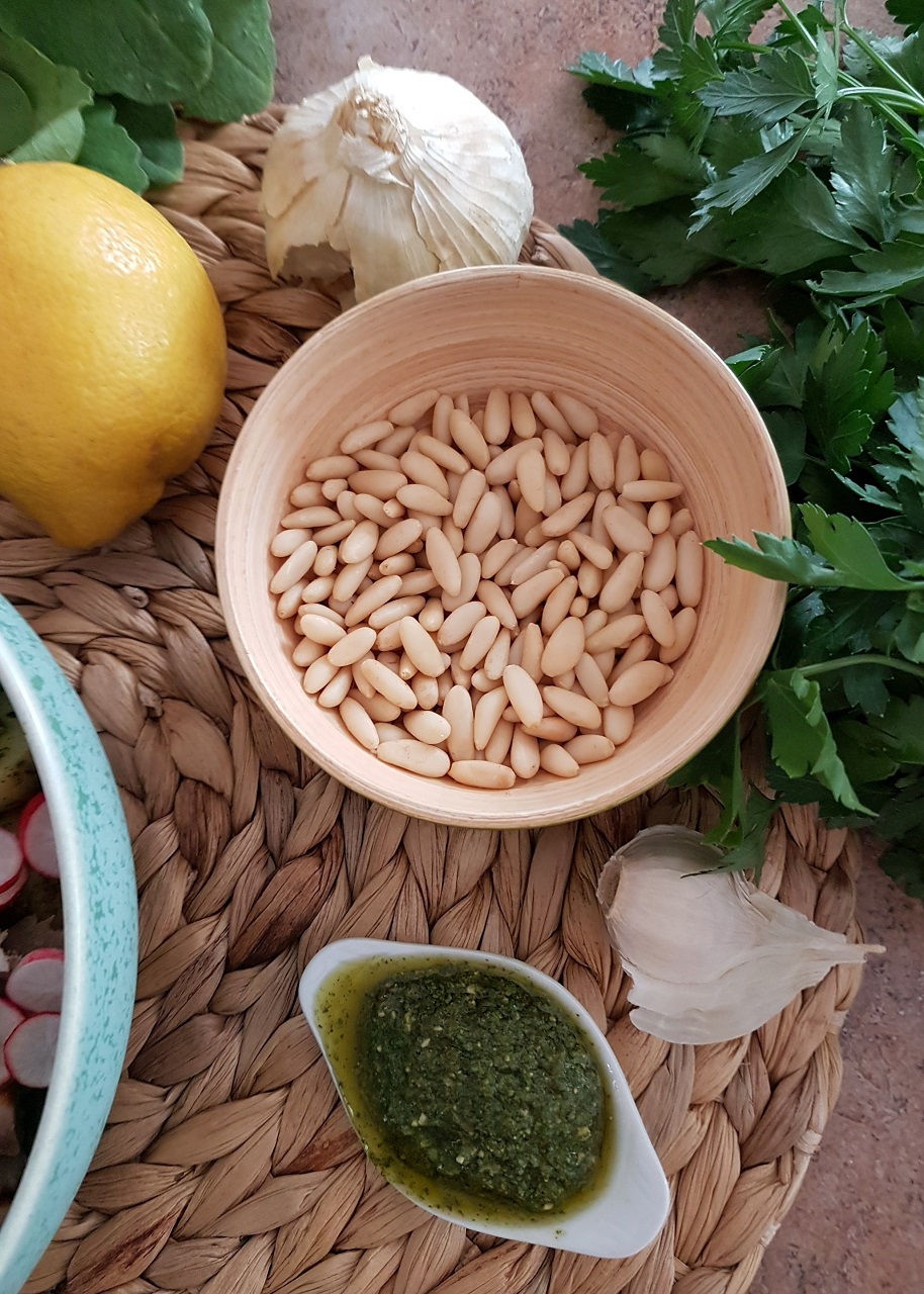 - Laver le persil et l’effeuiller, puis l’ajouter dans le blender avec les pignons de pin, la gousse d’ail pressée, le jus de citron, le sel, le poivre et l’huile.