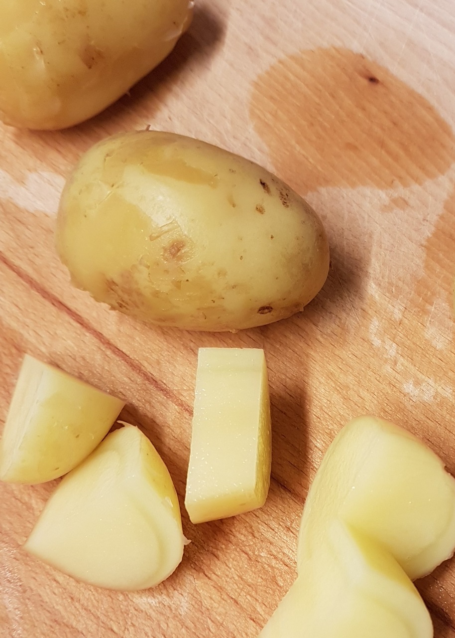 - Brosser les pommes de terre nouvelles sous l’eau courante, les couper en gros dés et les cuire à la vapeur pendant 10 minutes.