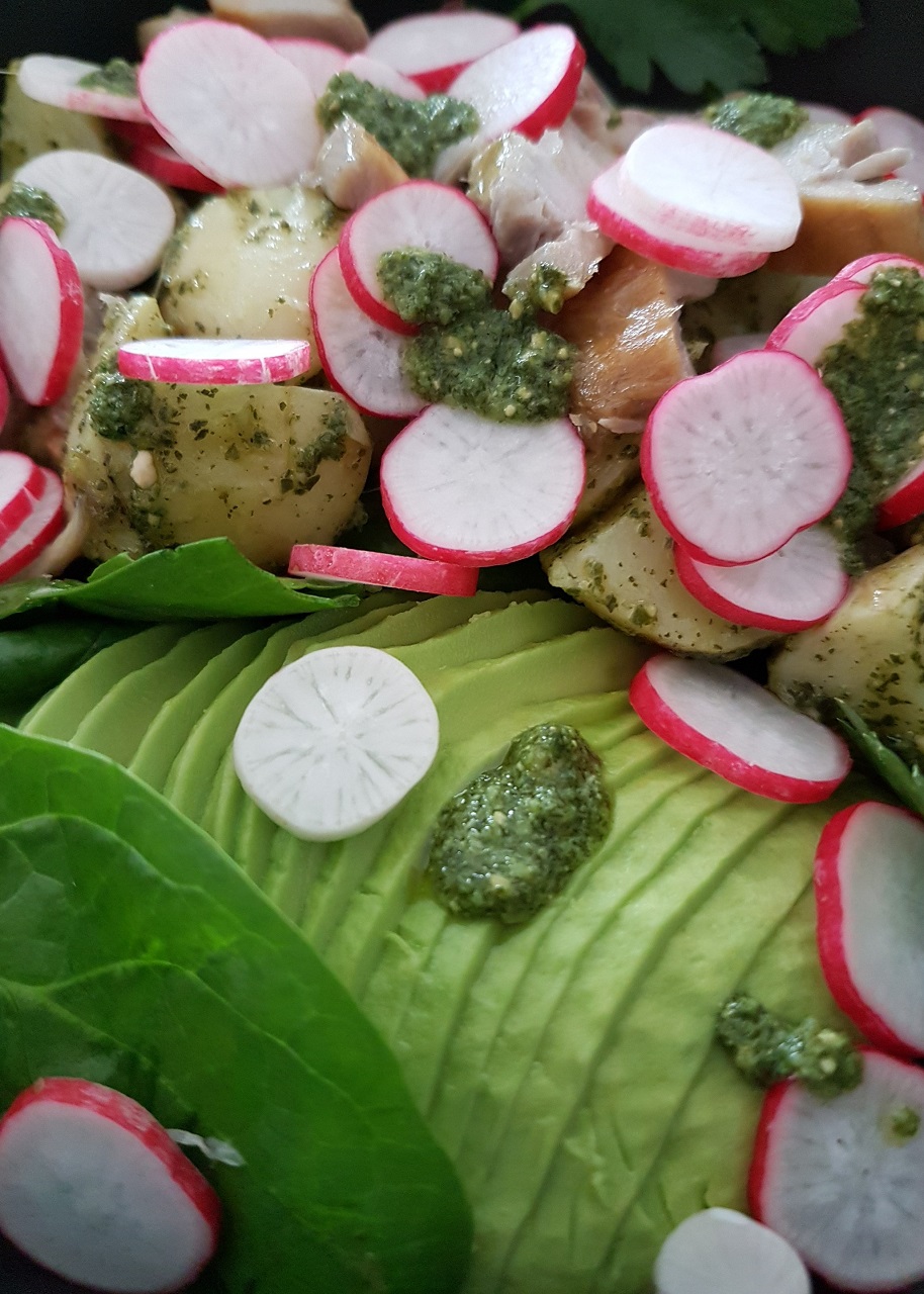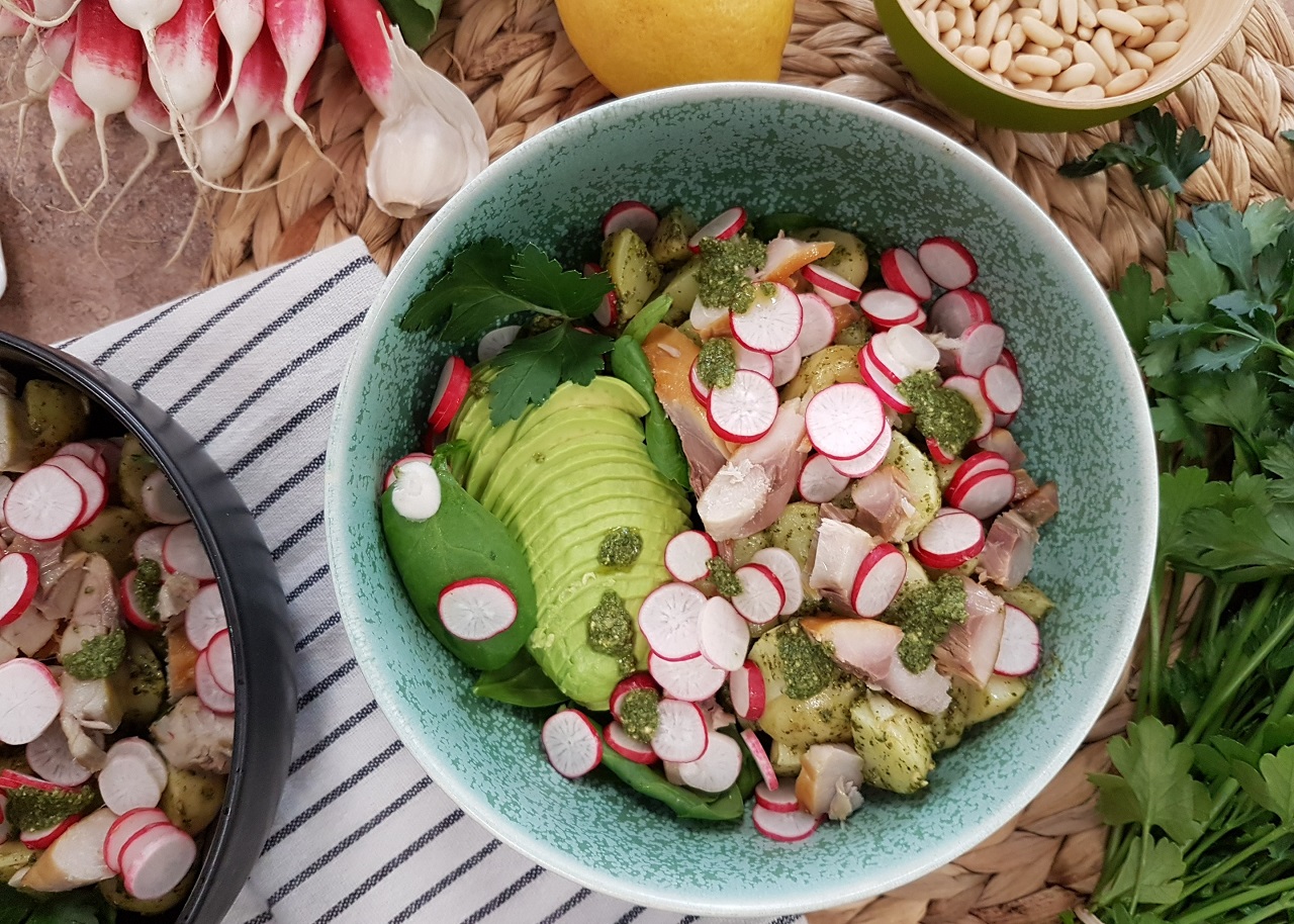 Salade de pommes de terre nouvelles, avocat et maquereau au pesto de persil