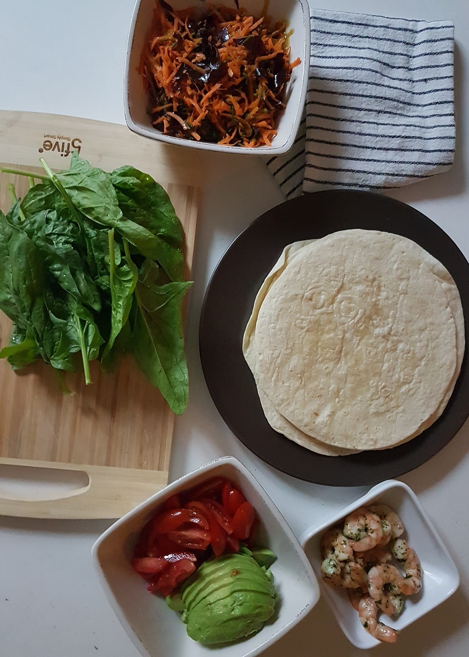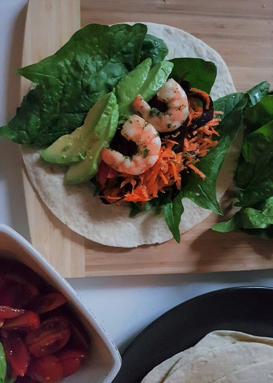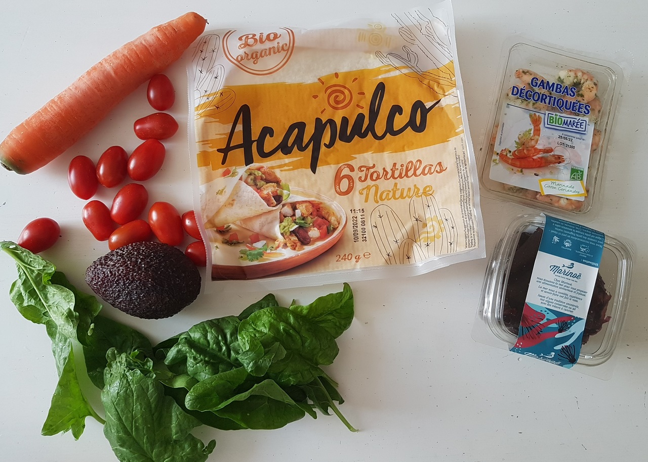- Garnir chaque tortilla de trois feuilles d’épinards, de carottes et d’algue dulse, de tomates cerises, de lamelles d’avocat et de deux gambas.