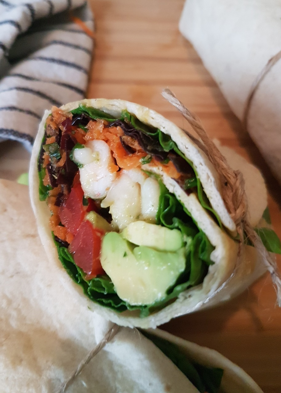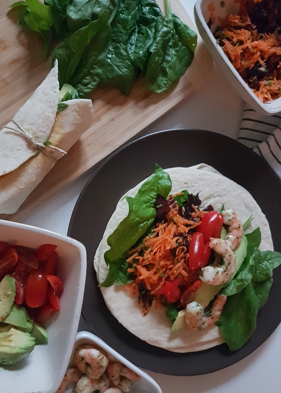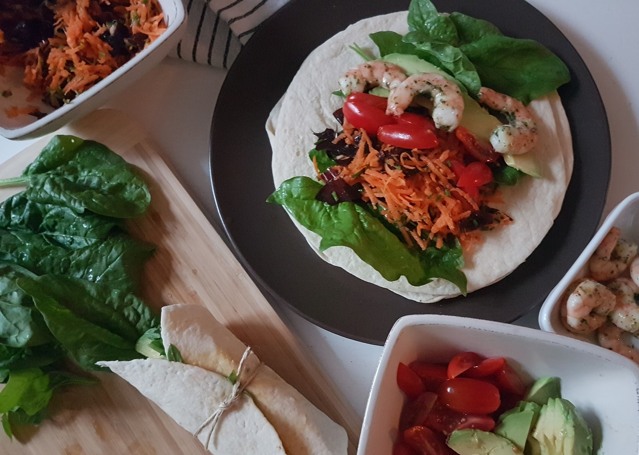 Si vous manquez d’idées pour votre lunch box, je vous propose aujourd’hui une recette de wraps de printemps à base de tortillas de blé et de gambas marinées au citron et à la coriandre.