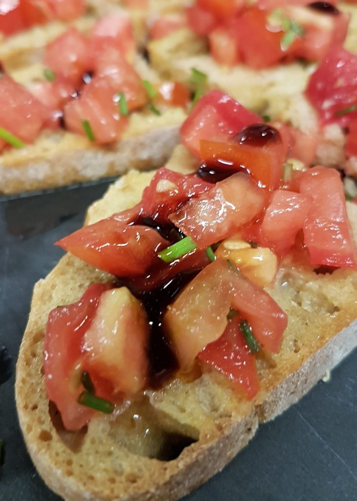 - Disposer sur les tartines, ajouter un filet de condiment au vinaigre balsamique et déguster !