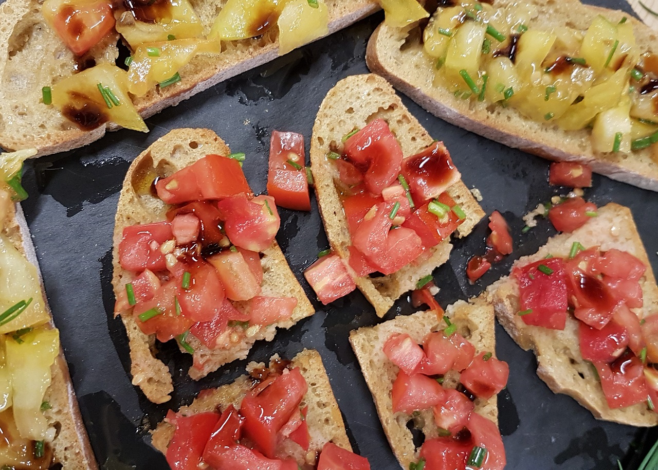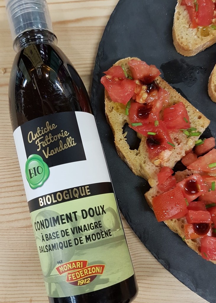 La recette que je vous propose est fraîche, vitaminée, gourmande et parfumée : des bruschettas aux tomates anciennes finement tranchées, au basilic et à l’huile d’olive, sur lesquelles j’ajoute un filet de condiment au vinaigre balsamique.