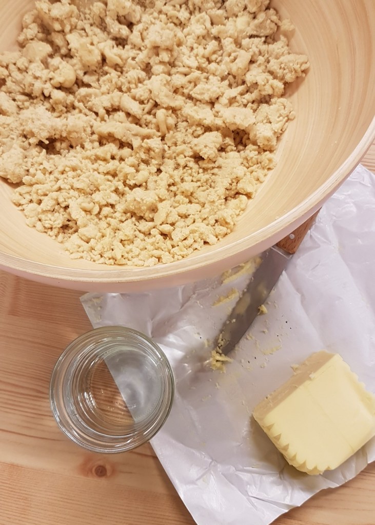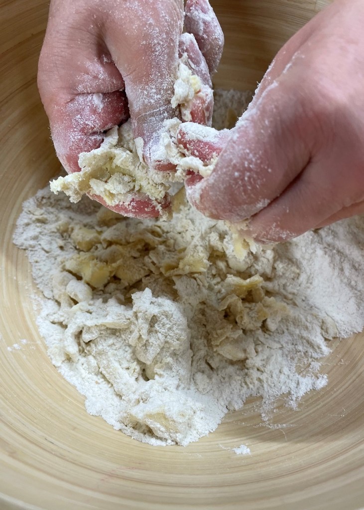 - Incorporer des cubes de beurre à la farine de manière à obtenir une semoule grossière, comme pour un crumble.