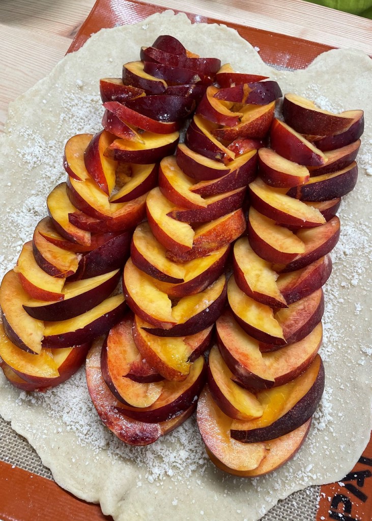 - Recouvrir la pâte de poudre d’amande et disposer les tranches de nectarines harmonieusement.