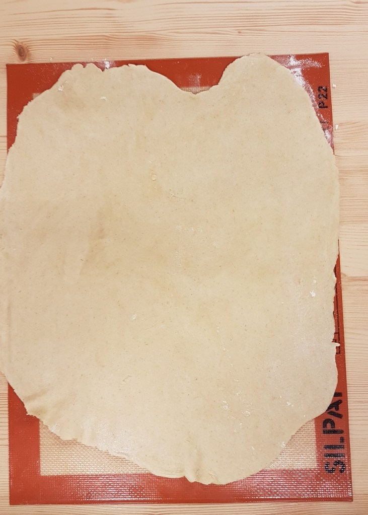 - Étaler grossièrement la pâte et la poser sur une plaque de four garnie d’un papier cuisson.