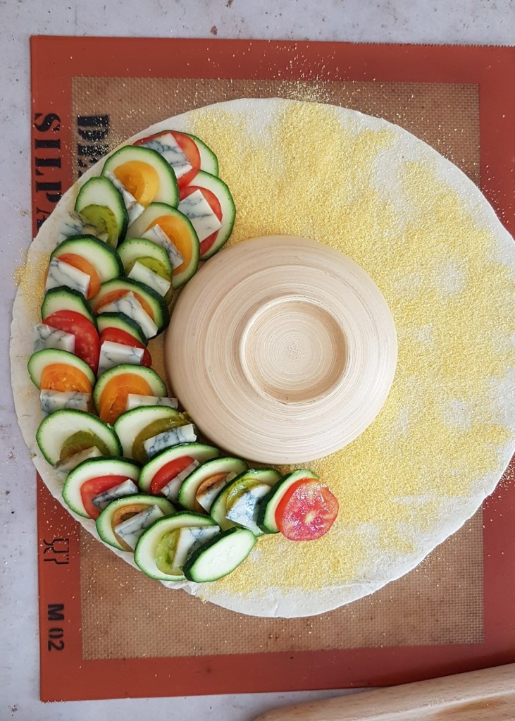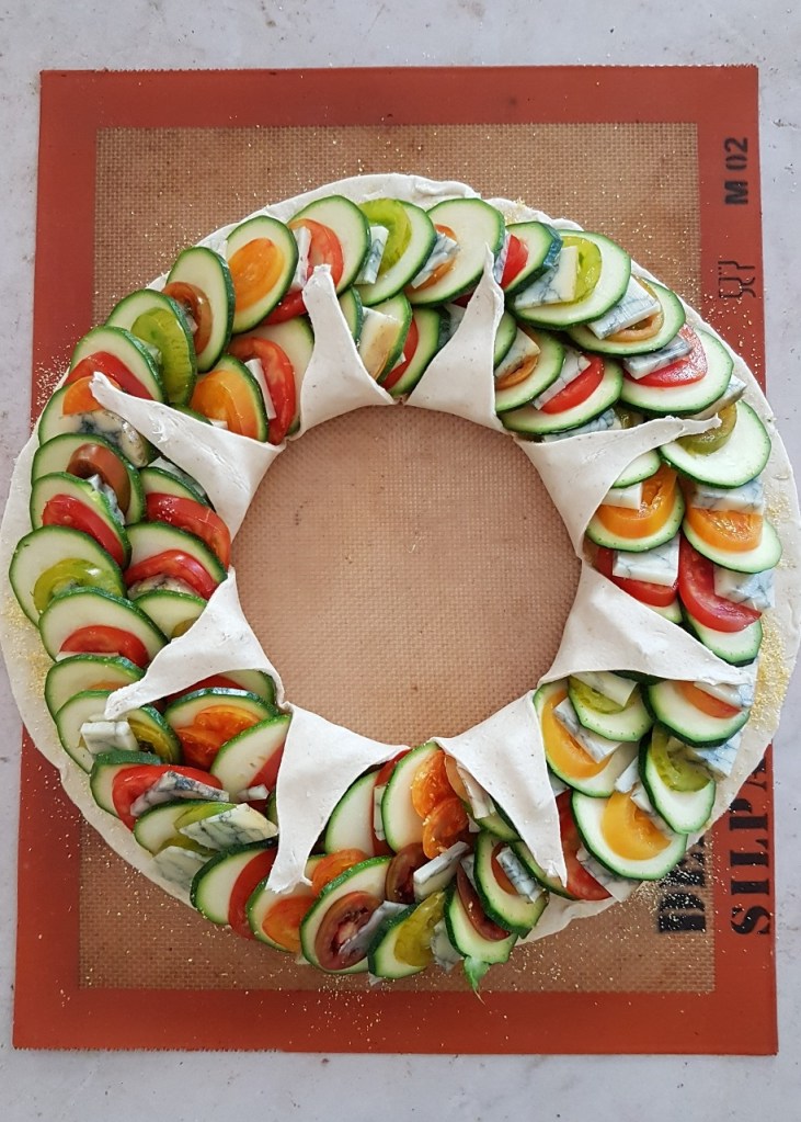- Retirer le bol, couper le centre de la pâte en étoile et rabattre les lanières sur la garniture.