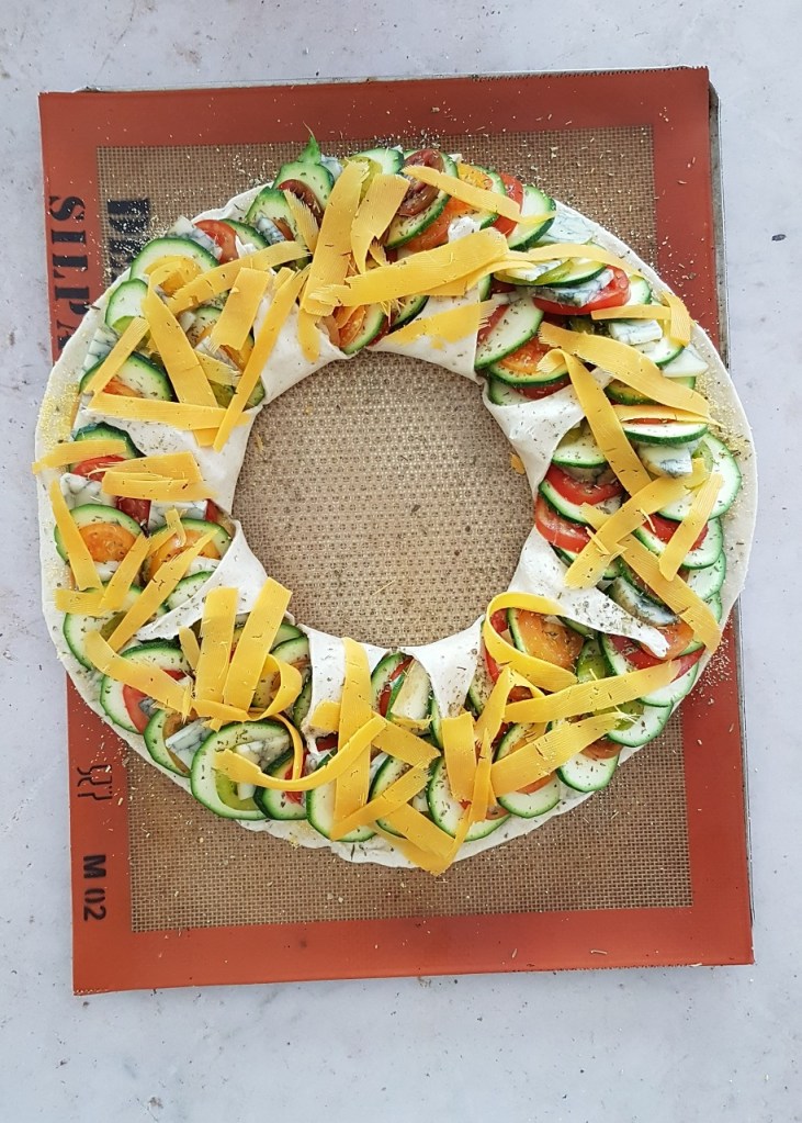 C’est un plat facile à réaliser et très esthétique : la pâte est bien croustillante, le cheddar est délicatement parfumé et les légumes apportent de la fraîcheur !