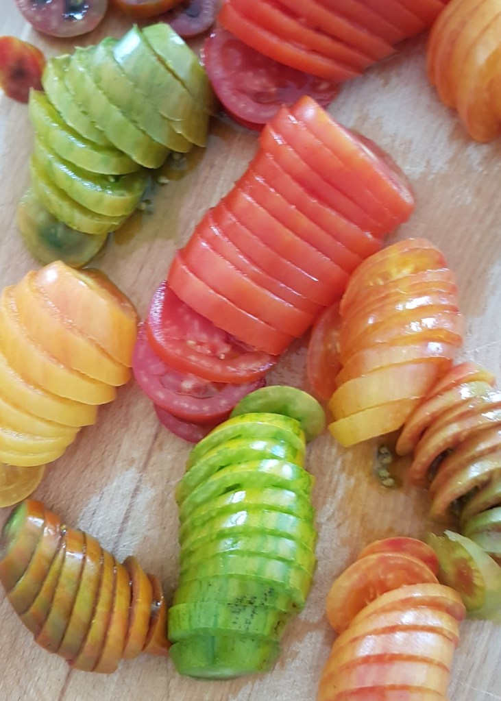 - Passer la courgette à la mandoline et découper les tomates en lamelles.