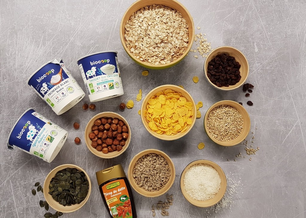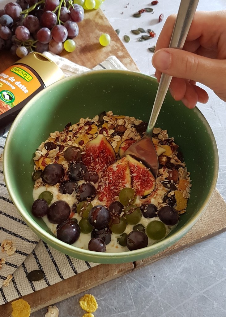 L’association du muesli avec un produit laitier (ou un yaourt végétal à la noix de coco) apporte des protéines et du calcium, ainsi que de la fraîcheur ; le tout est complété par les fruits frais et le sirop de dattes (produit sucrant 100% naturel).