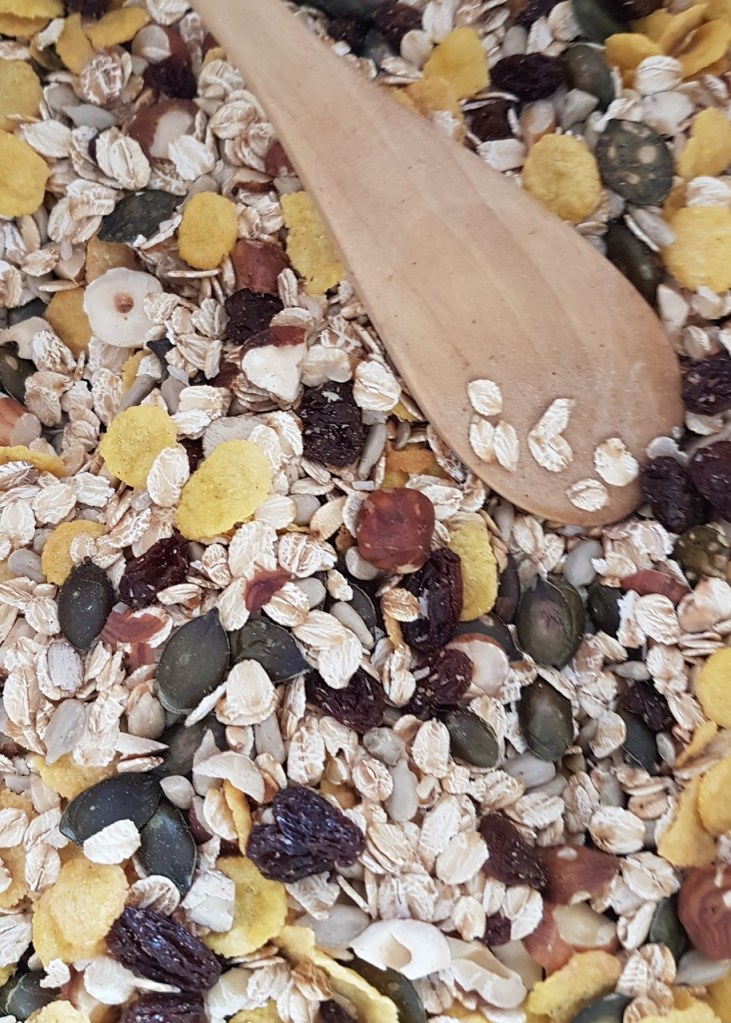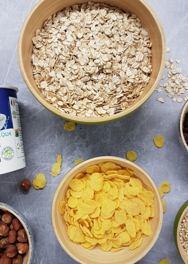 - textures variées (corn flakes croustillants, fruits secs moelleux…)