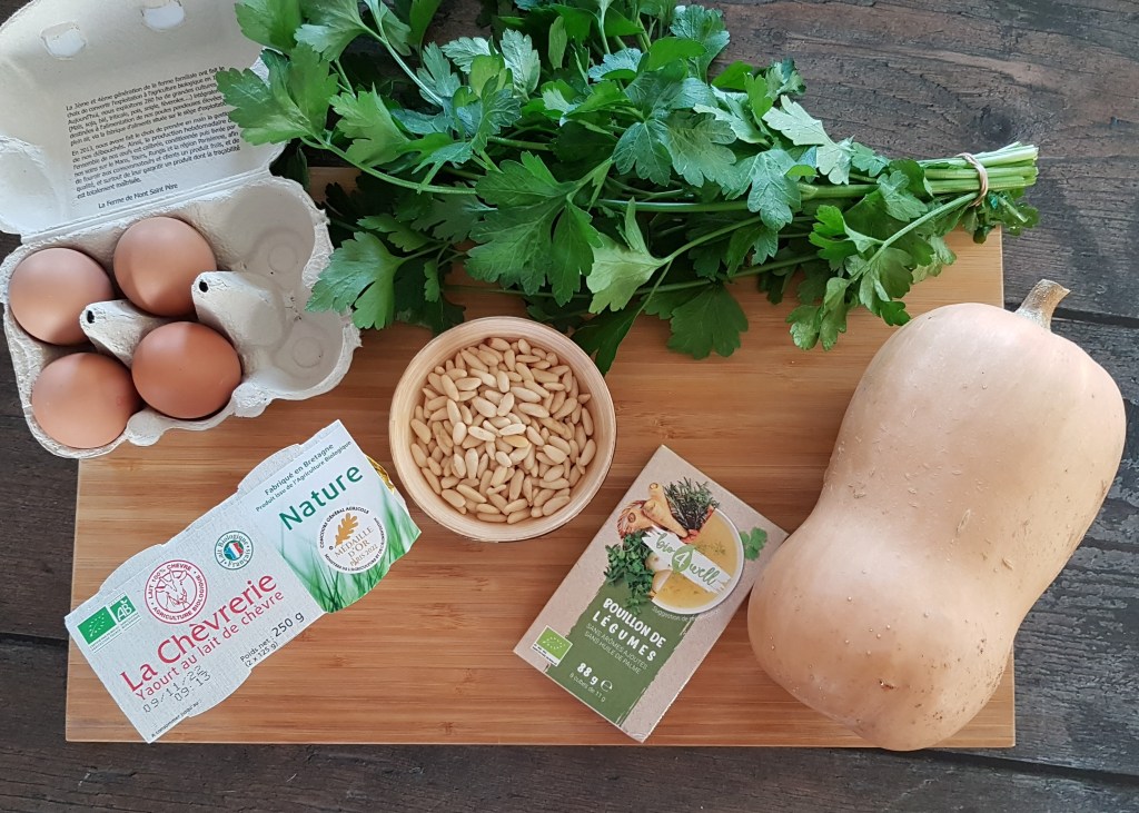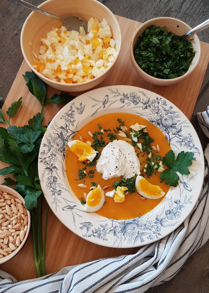 Commençons par la recette imaginée par Nicolas, une soupe de courge butternut très veloutée, agrémentée d’un yaourt au lait de chèvre, d’un œuf mollet, de pignons de pin torréfiés et de feuilles de coriandre ou de persil. Un petit chef-d’œuvre visuel et gustatif !