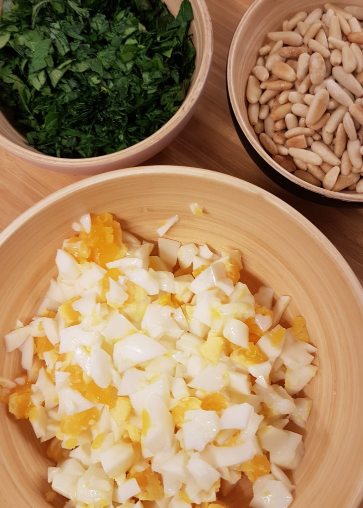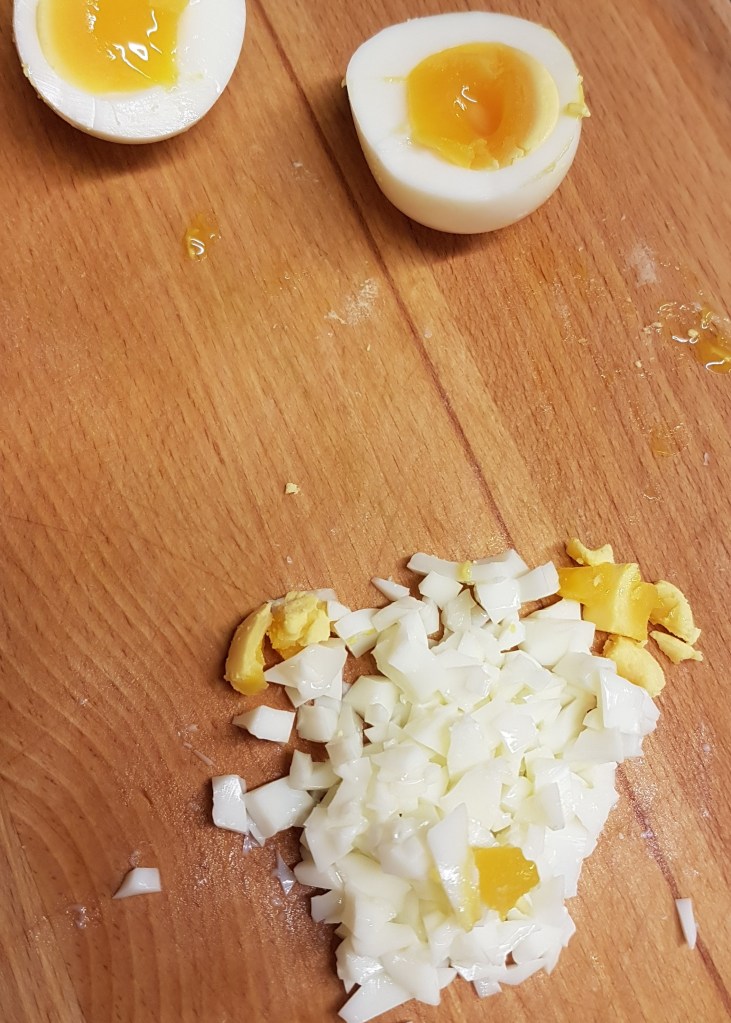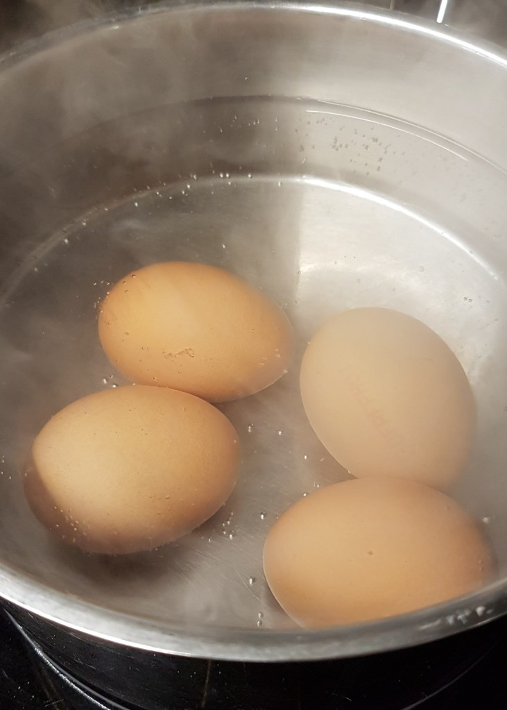 - Porter une casserole d’eau à ébullition avec une pincée de gros sel, y plonger les oeufs et les laisser cuire 6 minutes. les rafraichir dans l’eau froide et les écaler. Réserver.