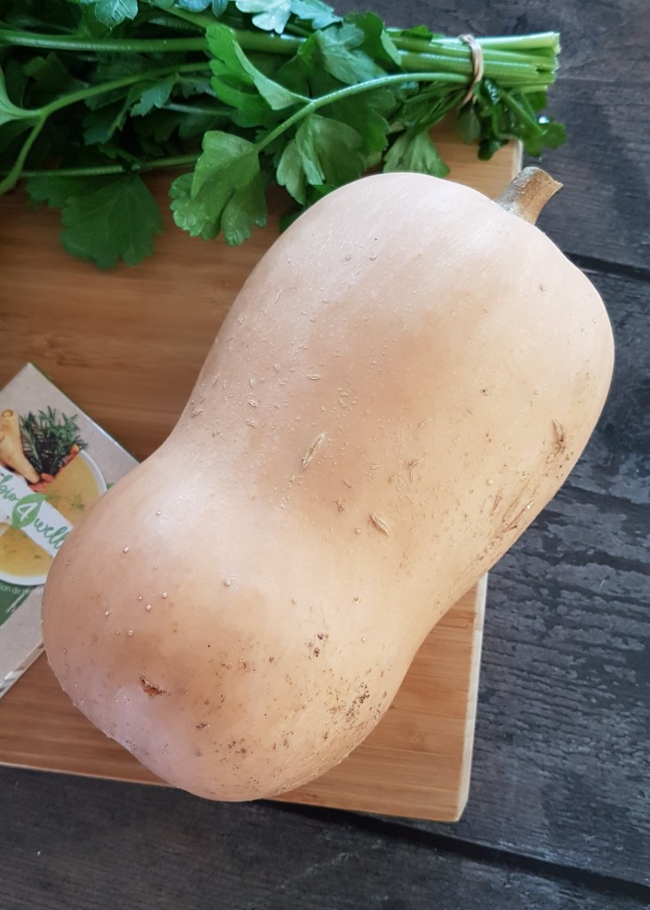 La courge butternut est la courge préférée de Nicolas, car elle est plutôt facile à éplucher avec un économe adapté. Sa chair est tendre, sa cuisson rapide et sa saveur beurrée.