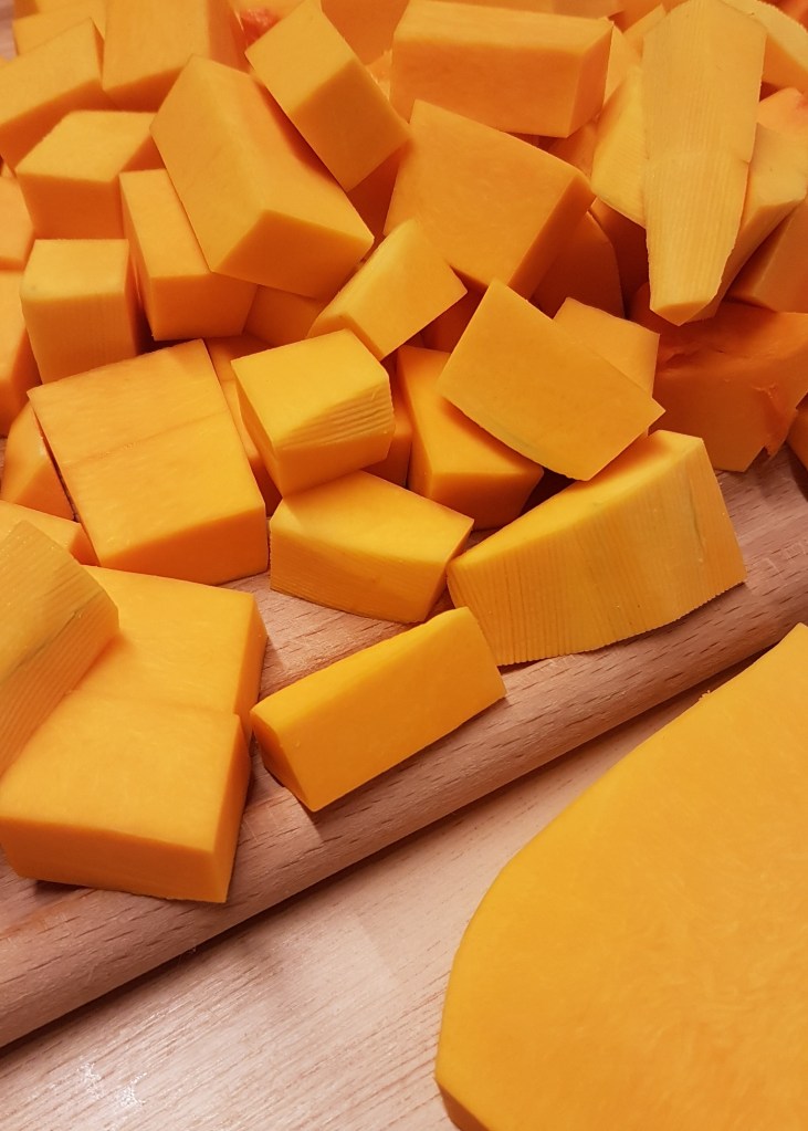 - Eplucher la courge butternut, la couper en deux, l’épépiner et la tailler en cubes.
