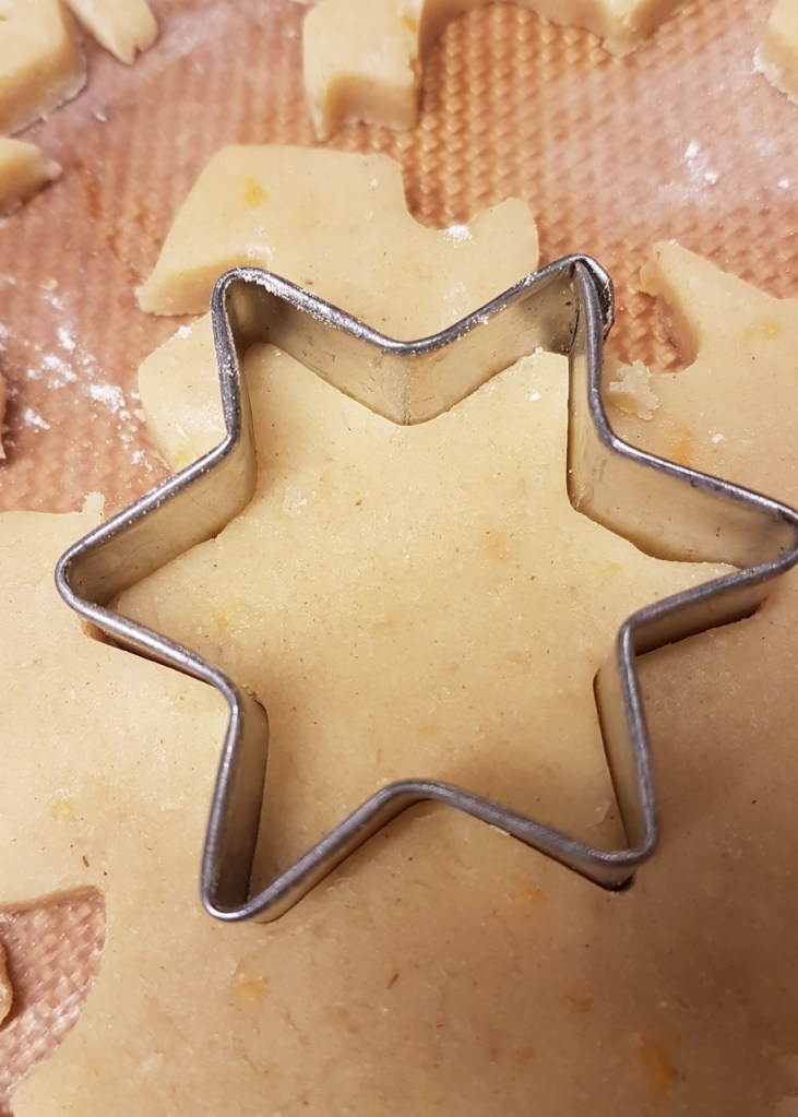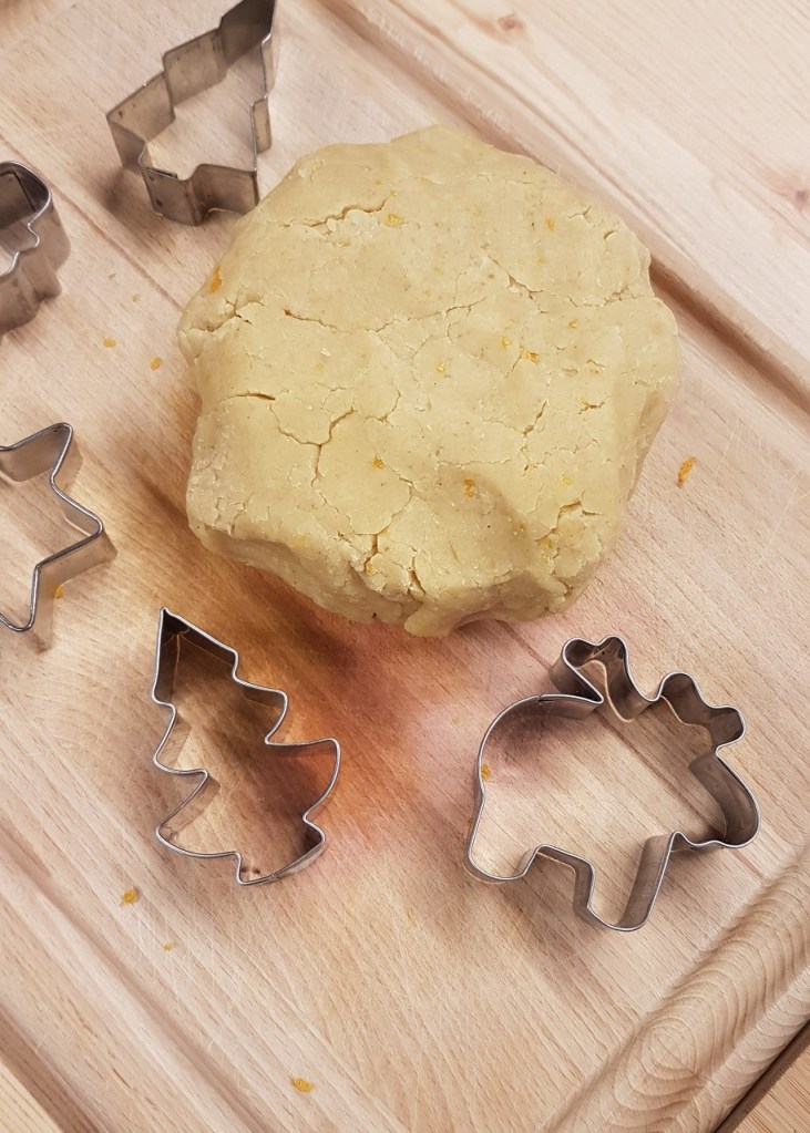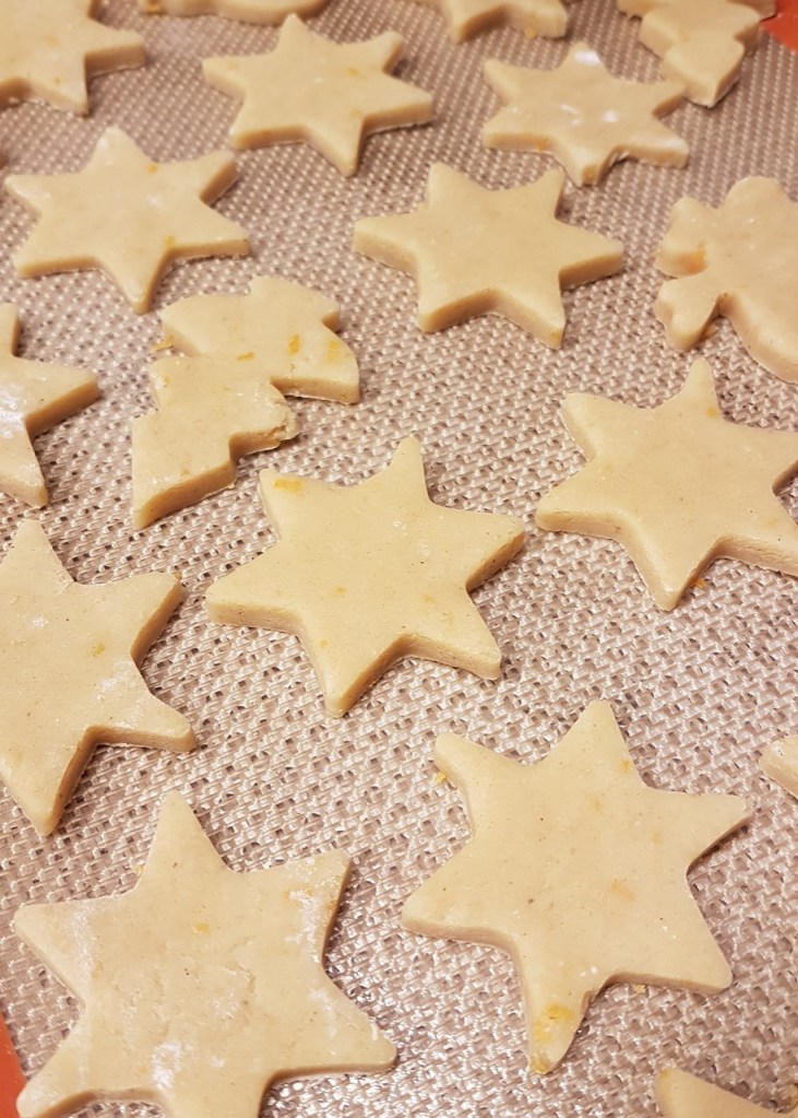 - Abaisser la pâte sur une épaisseur de 0,5 cm et la découper avec des emporte-pièces de Noël.