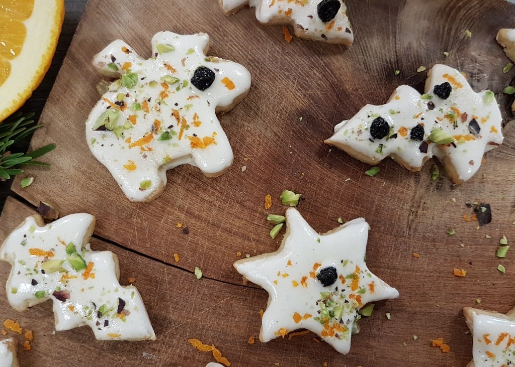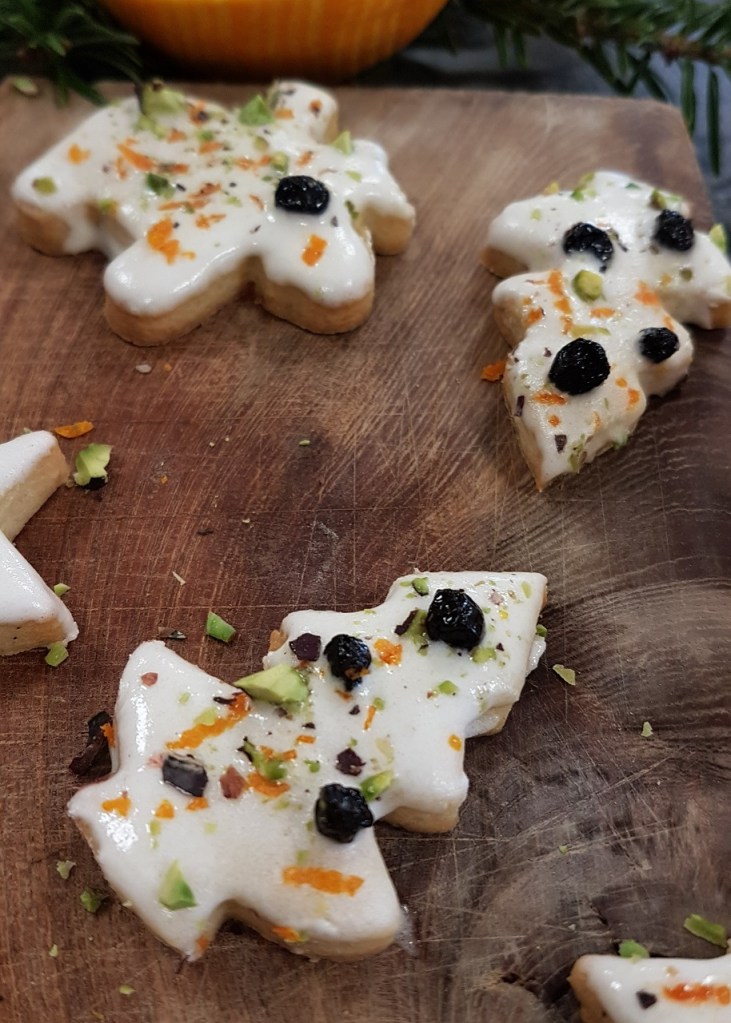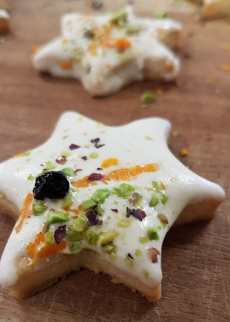 - Tremper les biscuits dans le glaçage, les poser sur une plaque et les saupoudrer de pistaches émincées, zeste, myrtilles séchées… Laisser le glaçage reposer 24h pour qu’il sèche et déguster !