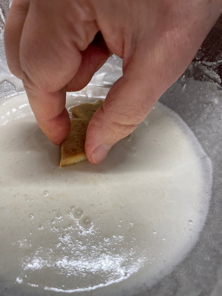 Le glaçage est assez simple à réaliser : comme notre sucre glace ne contient pas d’anti-agglomérant, il sera sans doute nécessaire de le tamiser puis de le délayer avec le blanc d’œuf en le fouettant vigoureusement.