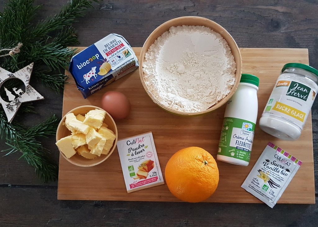 - Préparer les biscuits : dans un cul-de-poule, mélanger la farine, la poudre à lever, le sucre glace, le sucre vanillé, le sel et le zeste d’orange.