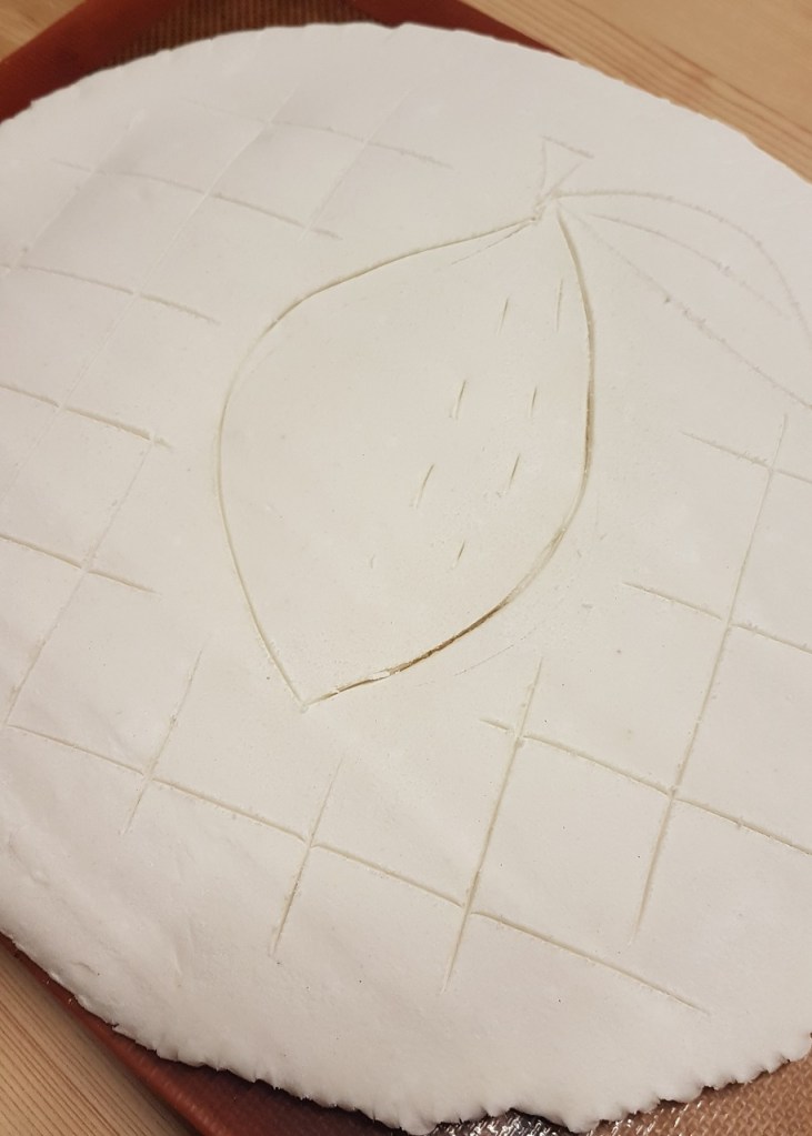Pour habiller ma galette, j’ai dessiné à l’aide de la pointe d’un couteau un citron sur la pâte et je l’ai chiquetée, c’est-à-dire que j’ai pincé le bord de la pâte et que je l’ai incisé à l’aide de mon couteau.