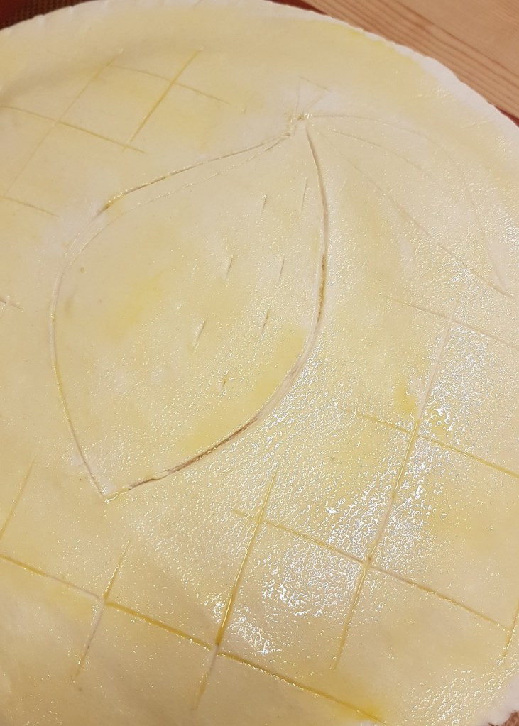 - Quadriller la surface sans trancher la pâte et dorer avec le jaune d’œuf.