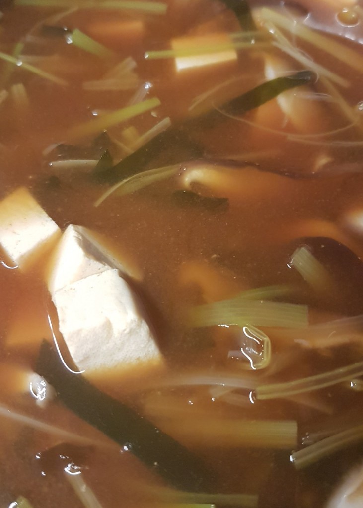 Soupe de miso aux poireaux, champignons shiitakés, algue wakamé et tofu