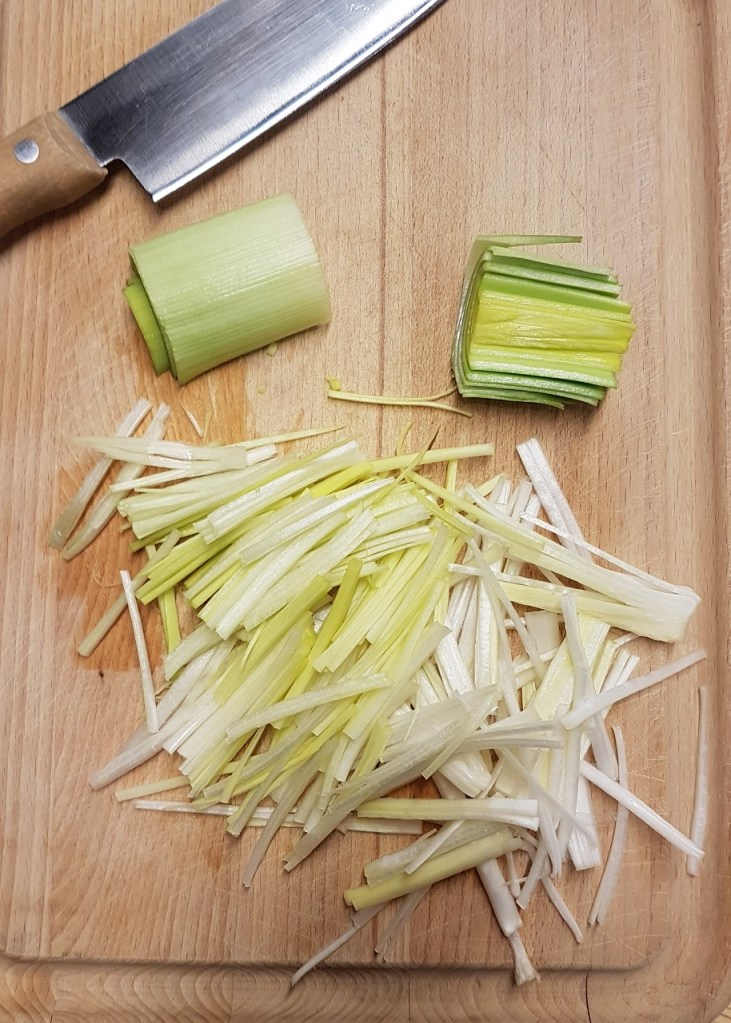 - Porter l’eau à ébullition dans une casserole. Hors du feu, plonger les champignons et la julienne de poireau dans l’eau.