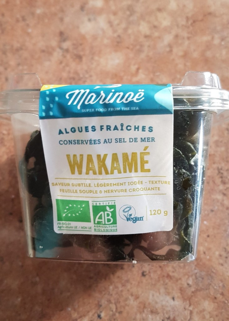 L’algue wakamé fraîche est conservée à l’aide de sel de mer, sa saveur est subtile et légèrement iodée, sa texture est souple et ses nervures sont légèrement croquantes.