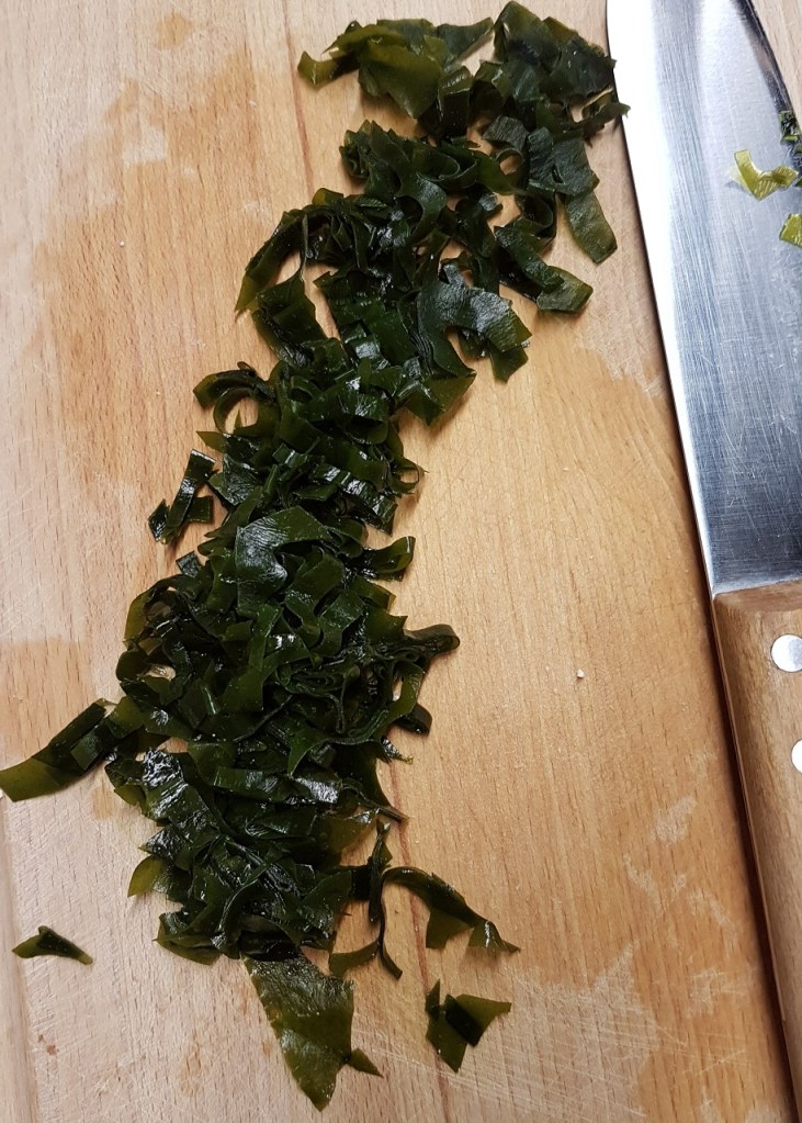 - Rincer l’algue sous l’eau courante, l’essorer et l’émincer finement.
