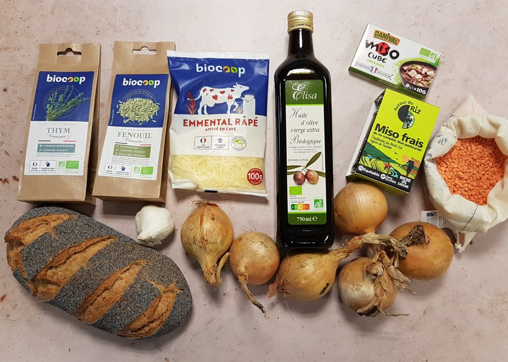 - Déguster la soupe avec une tartine d’oignons au miso gratinée à l’emmental !