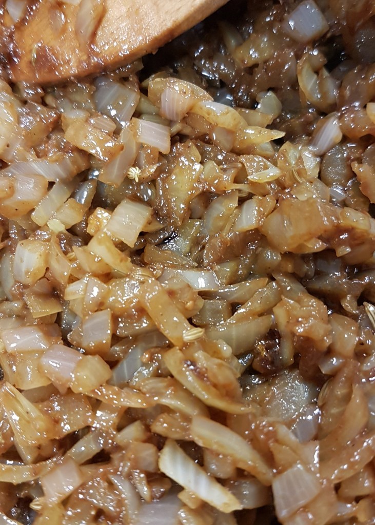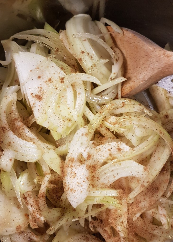 - Verser l’huile d’olive dans un faitout, ajouter les oignons, les graines de fenouil et le mélange 4 épices. Laisser compoter à feu doux pendant 15 minutes en mélangeant régulièrement.