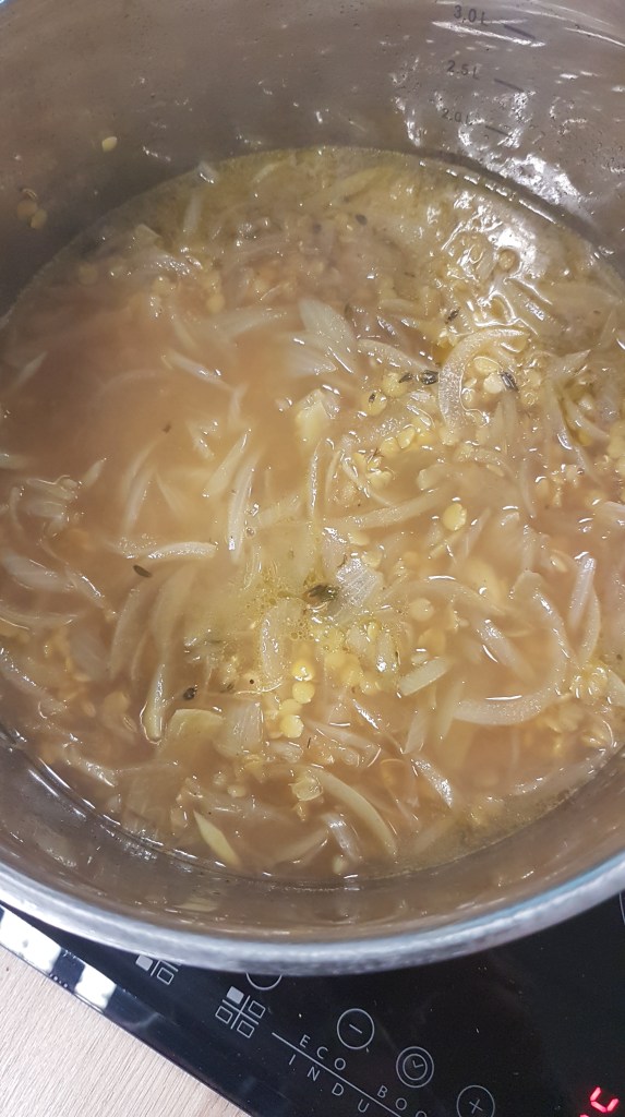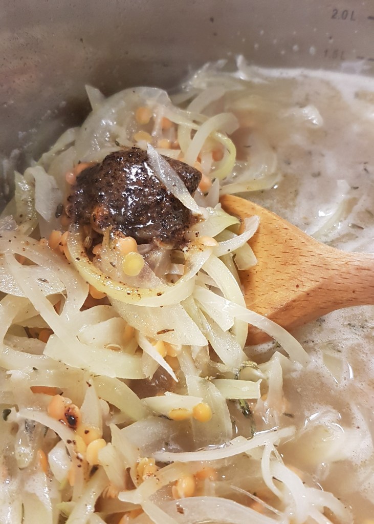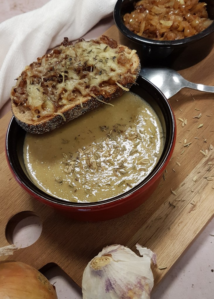 Velouté de lentilles corail à l'oignon et au miso, tartines de compotée d'oignon gratinées à l'emmental
