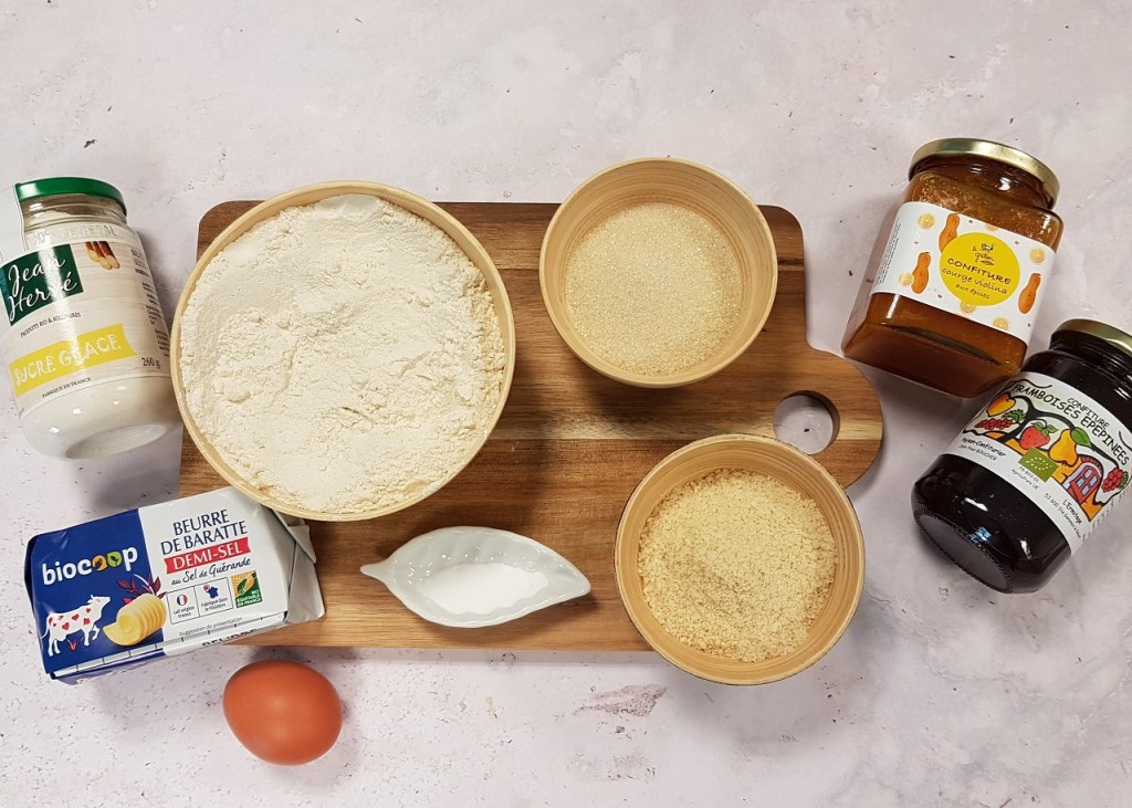 Pour apporter de la couleur à mes sablés, j’ai également utilisé la confiture de framboises épépinées de Jean-Yves Boucher : extrêmement concentrée en parfum, elle sublime le biscuit sablé.
