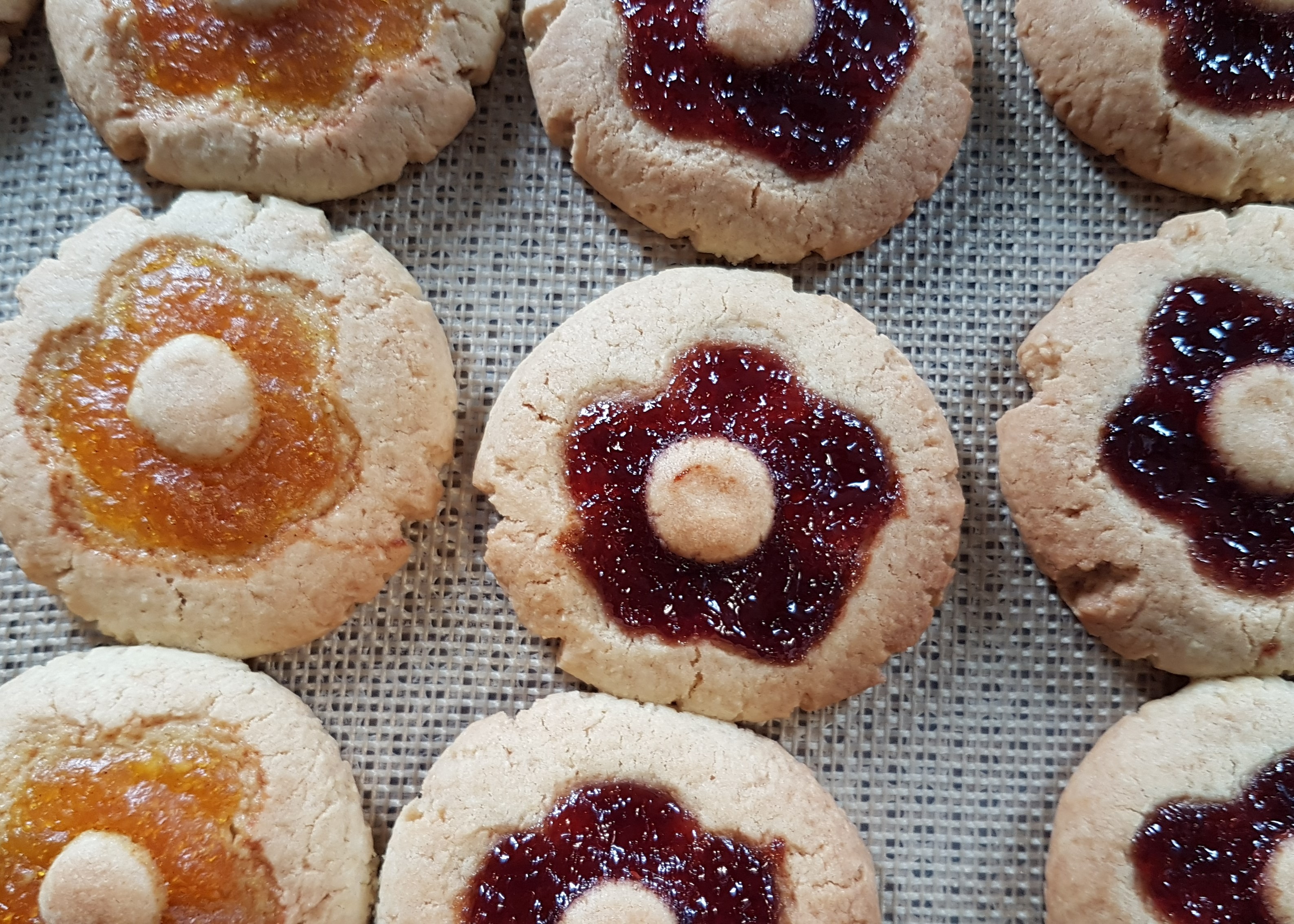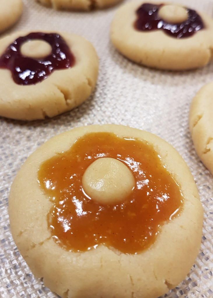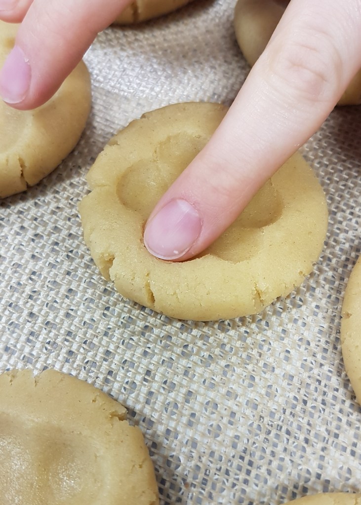 - Remplir l’empreinte de confiture et enfoncer chaque bille de pâte au centre du biscuit.