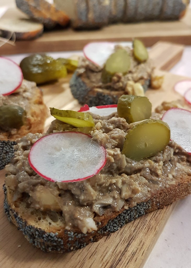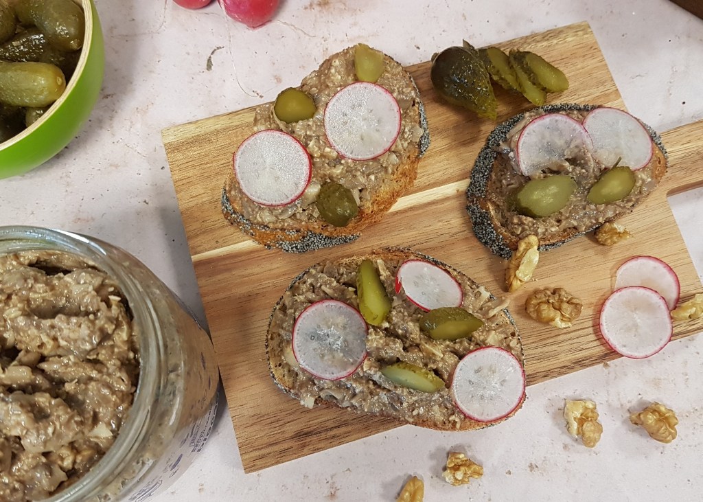 En ce début de Fête des vins et des fromages, je vous propose de découvrir un apéritif gourmand et vegan, une alternative aux traditionnelles rillettes sarthoises : il s’agit d’un pâté végétal aux champignons !