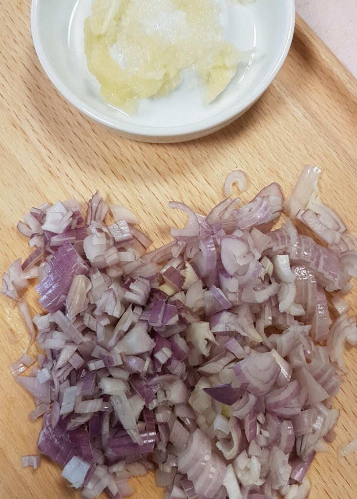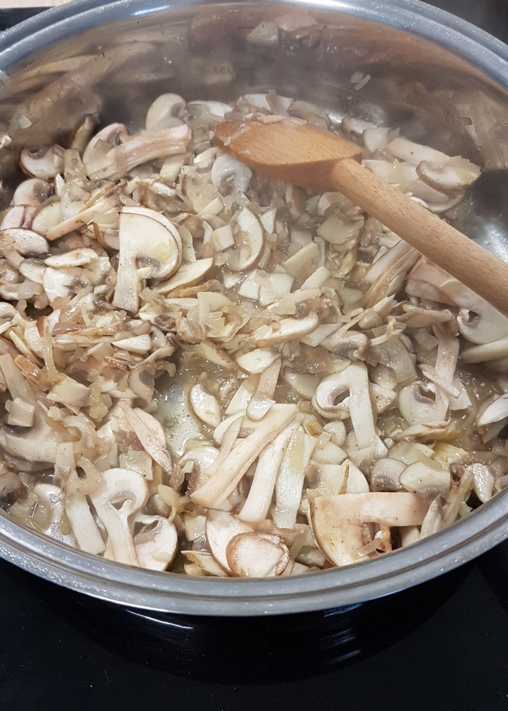 3. Faire chauffer l’huile d’olive dans une poêle et y faire revenir les échalotes, les champignons et la gousse d’ail pressée pendant une dizaine de minutes. Assaisonner.