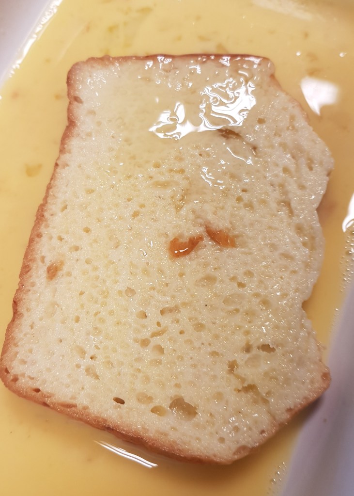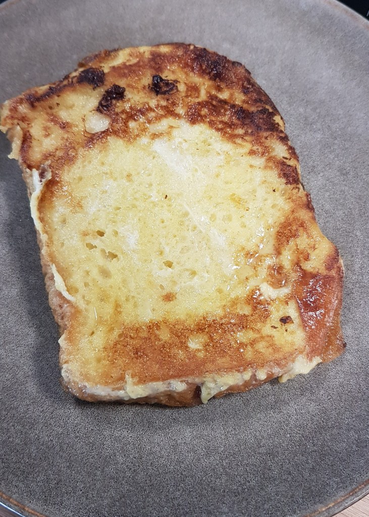 - Imbiber les tranches de brioche de lait, puis les tremper dans l’oeuf et les cuire 2 à 3 minutes sur chaque face jusqu’à ce qu’elles dorent (plus la brioche est sèche, plus il faut l’imbiber de lait !).