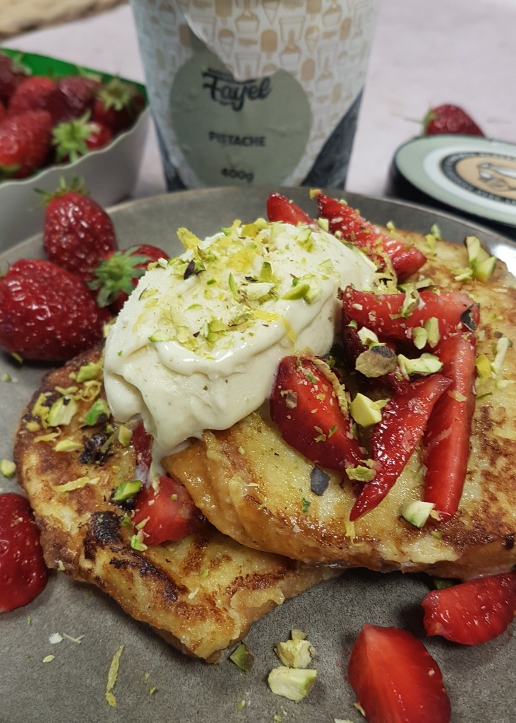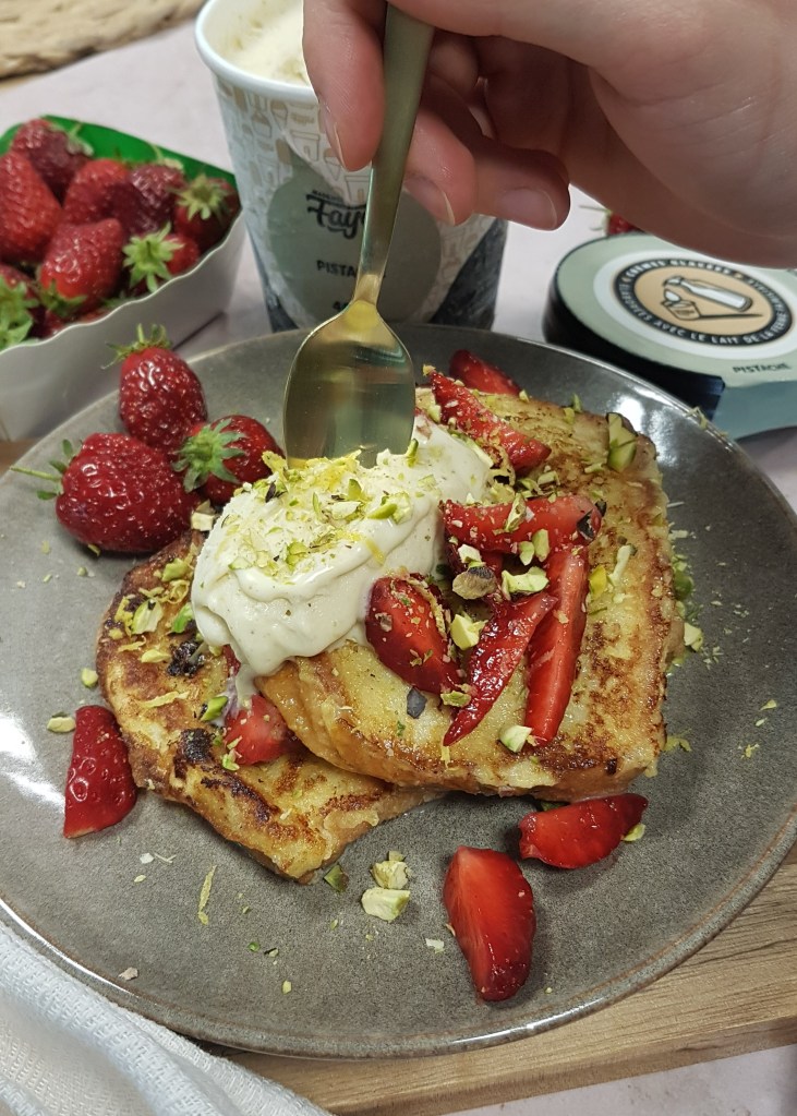 Pour accompagner ma brioche perdue, j’ai utilisé la crème glacée à la pistache qui se marie à merveille avec les fraises. Je propose un service à l’assiette en alternant brioche perdue, fraises tranchées en quatre, pistache concassées et quenelle de glace à la pistache.