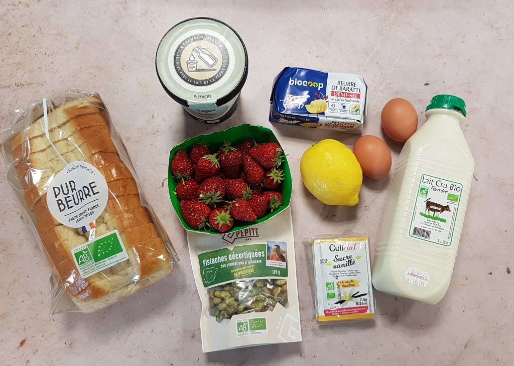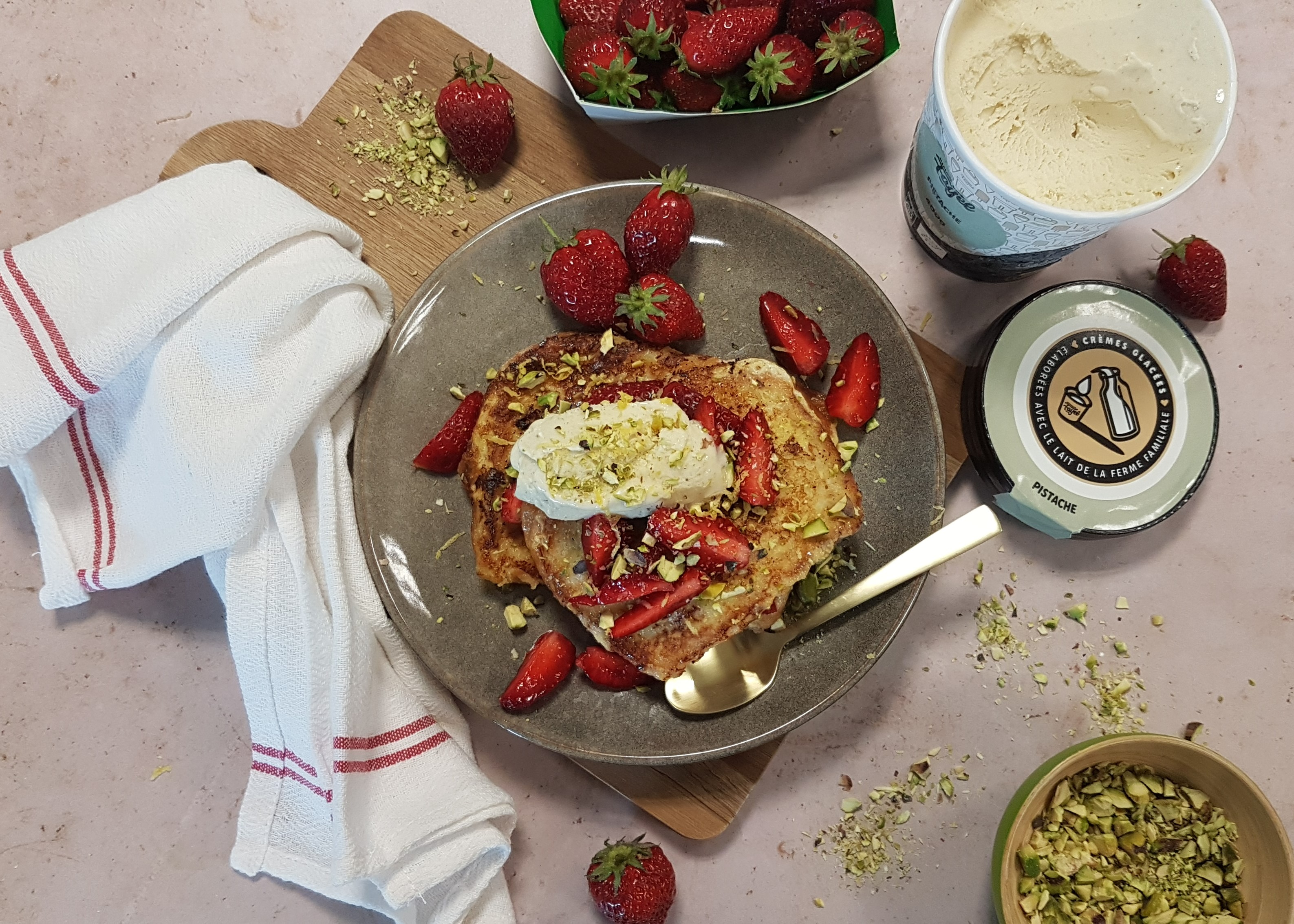 Par pure gourmandise, je vous propose aujourd’hui une version alternative à la brioche, aux fraises locales, aux pistaches et à la crème glacée. Un dessert merveilleusement régressif qui fait appel aux souvenirs d’enfance !