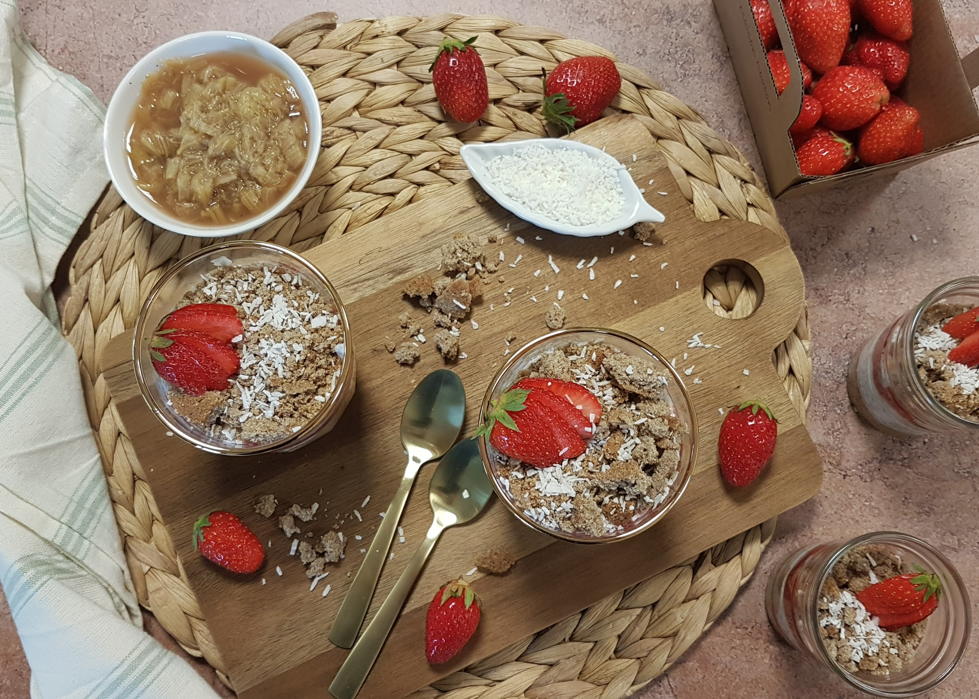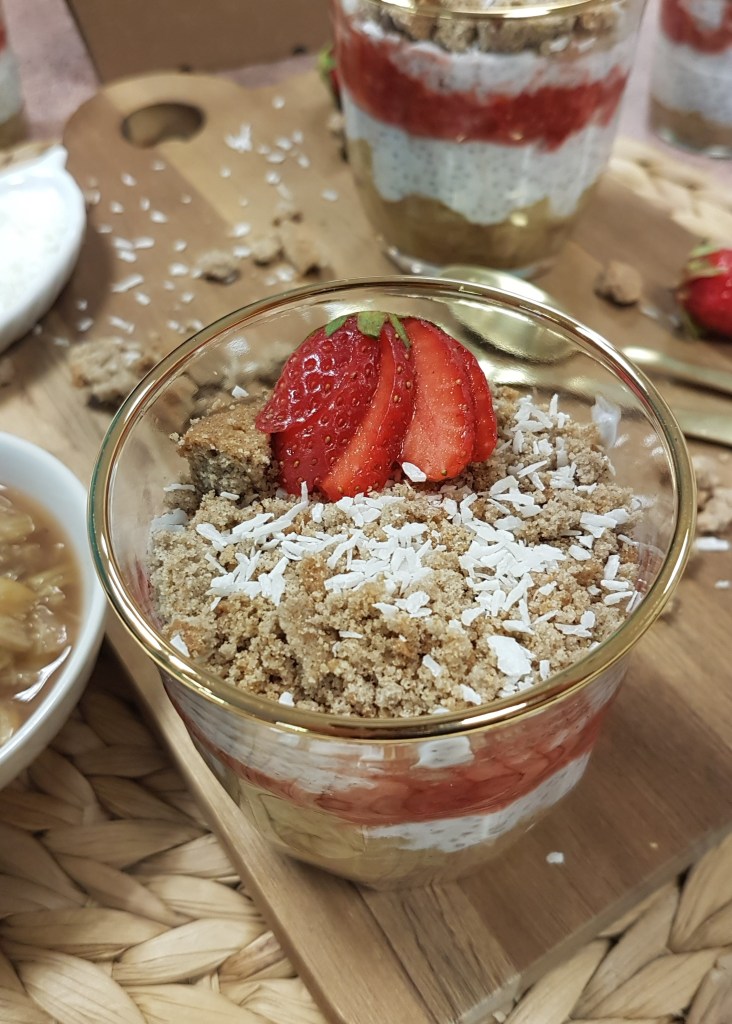 Le printemps est pour moi synonyme de desserts fruités : je vous propose aujourd’hui des verrines de compote de rhubarbe, de purée de fraises, de yaourt végétal à la noix de coco épaissi de graines de chia, le tout surmonté de palets breton au sarrasin concassés.