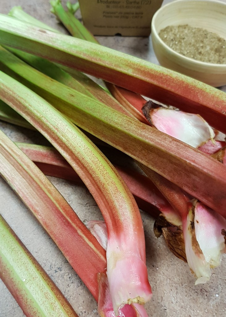 J’ai utilisé la succulente rhubarbe locale de Dominique Trichard du Panier à Roulettes, situé à La Chapelle-Saint-Aubin, à moins de 10 km du Mans.