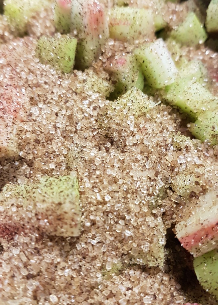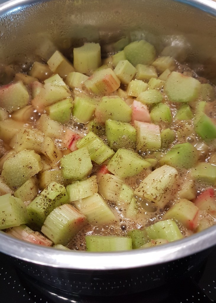 - Éplucher grossièrement la rhubarbe, la couper en petits tronçons et la cuire 20 minutes dans une casserole avec 60 g de sucre vanillé.