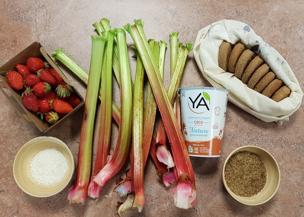 Compote de rhubarbe et purée de fraises, yaourt végétal aux graines de chia et sablés au sarrasin