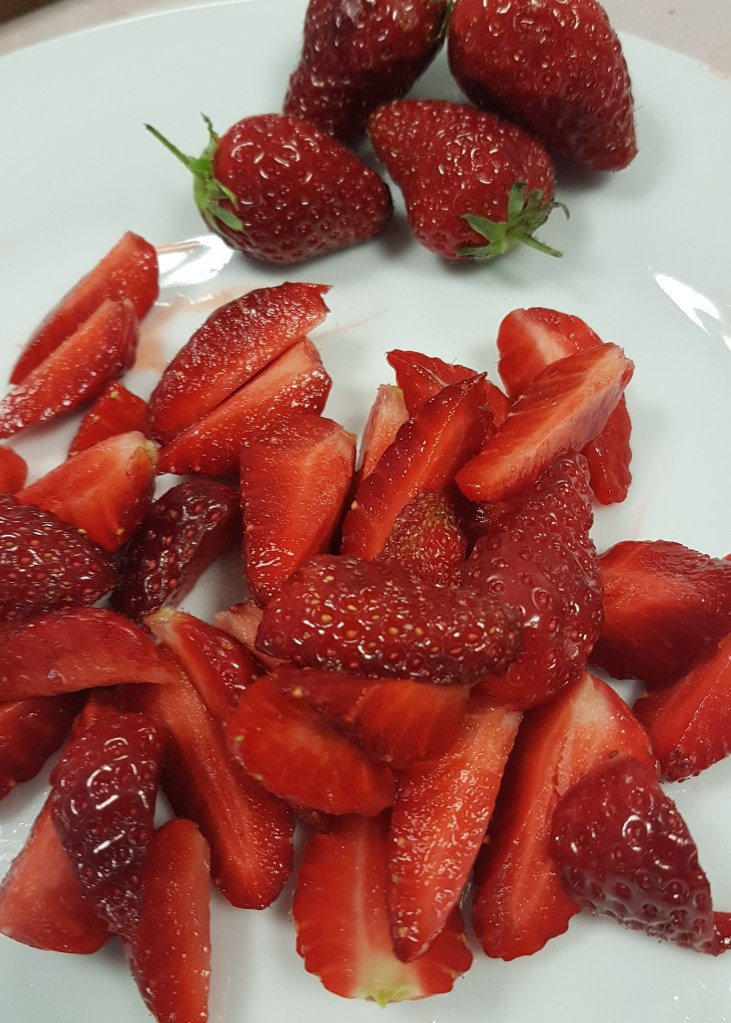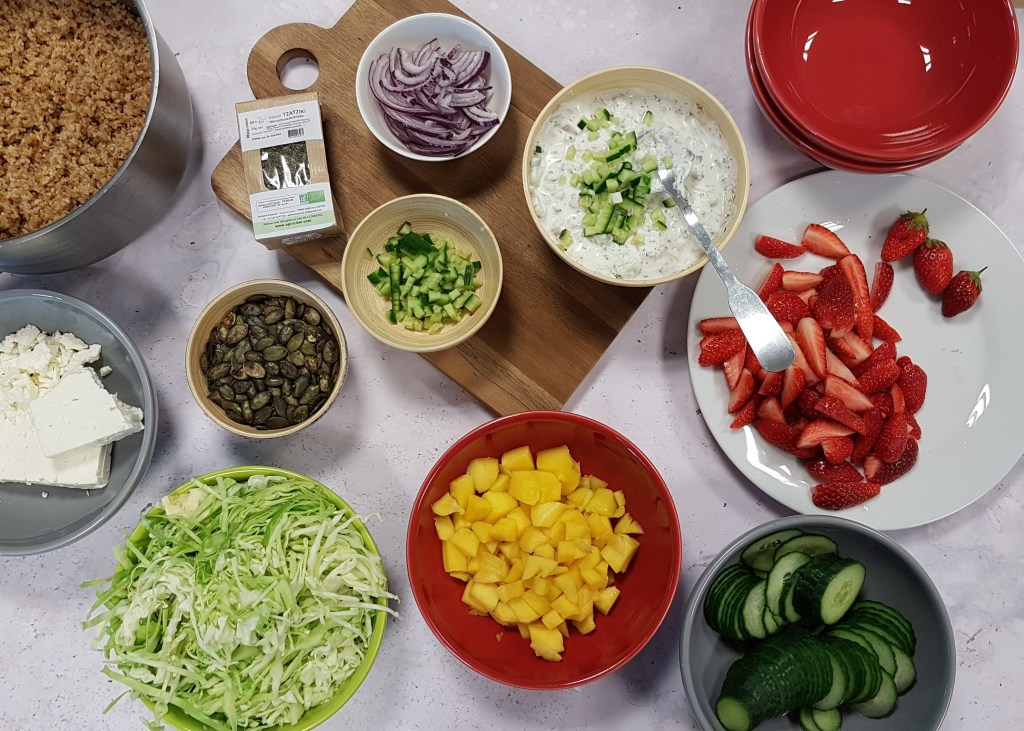 - Dresser les bols : deux cuillères à soupe bombées de petit épeautre, une poignée de chou pomme, du concombre, de l’oignon rouge, de la mangue et des fraises.