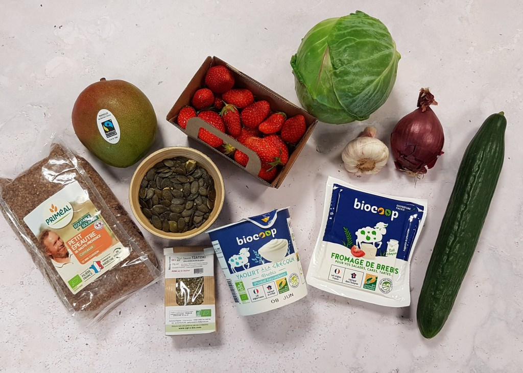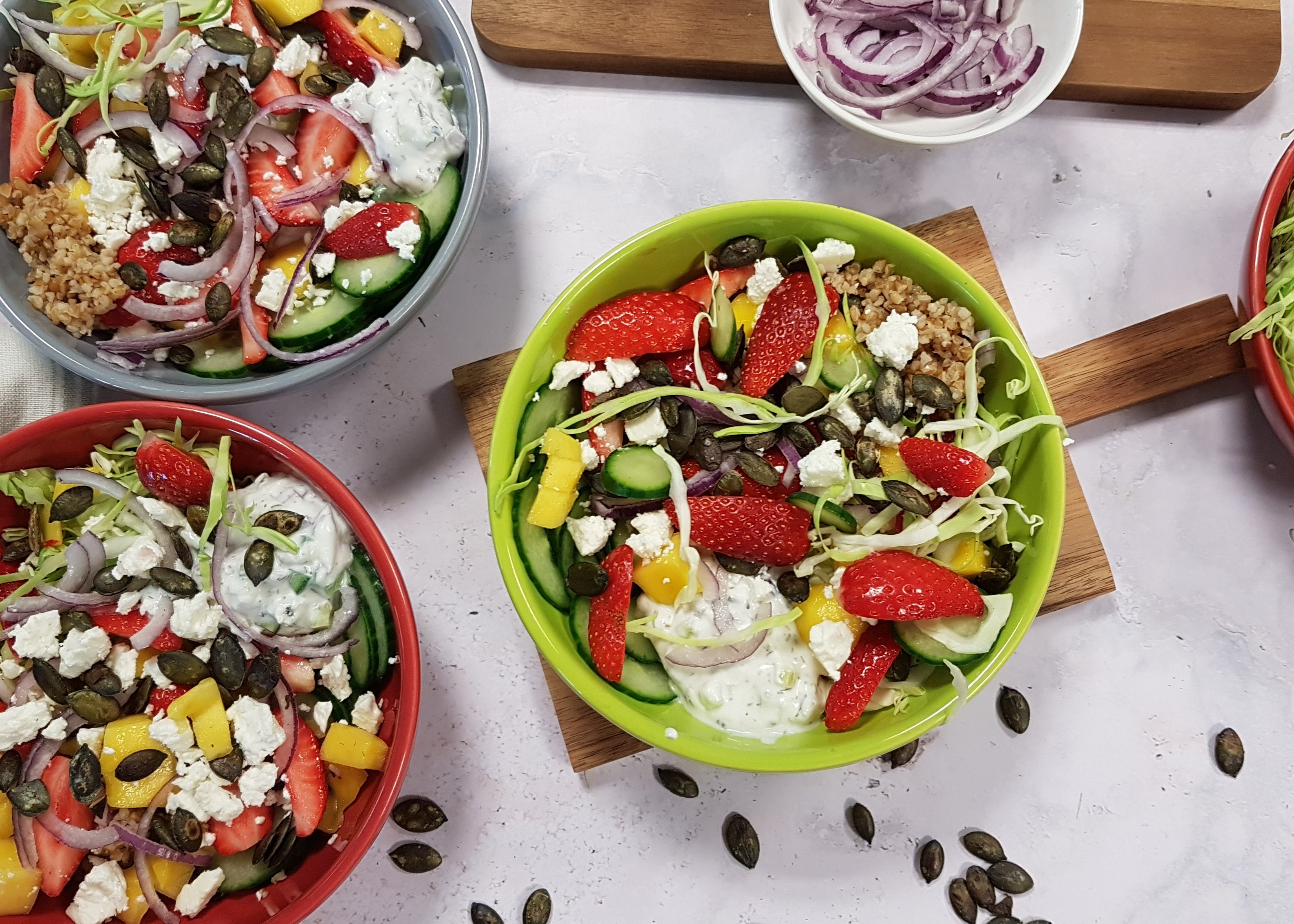 Salade de petit épeautre, chou pomme, mangue, fraises et sauce crémeuse tzatziki