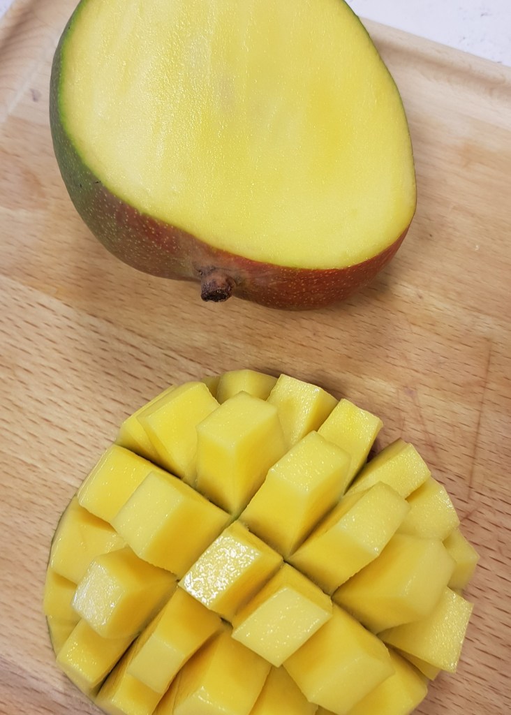- Couper la mangue de part et d’autre du noyau, l’entailler dans la longueur et la largeur, puis retourner la peau pour détacher les cubes.