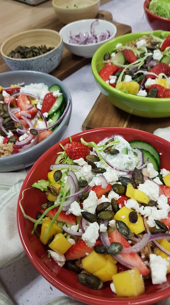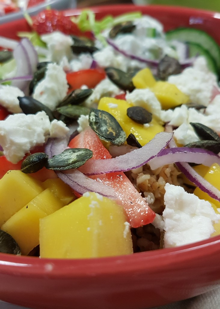 Elle contient beaucoup de saveurs et de textures différentes : le croquant du chou pomme, du concombre et des graines de courge, le côté doux et fondant de la mangue et de la fraise, la touche relevée de l’oignon rouge et la douceur saline de la feta.