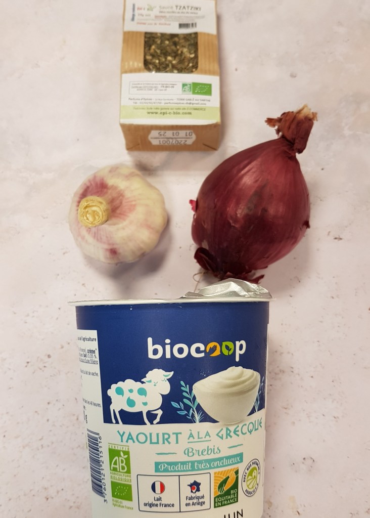 Cette sauce tzatziki au yaourt à la grecque est merveilleusement rélevée par l’oignon rouge ; à vous de doser la quantité souhaitée. J’aime particulièrement le mélange d’épices Epi’C bio qui contient de la menthe séchée qui et apporte de la fraicheur.