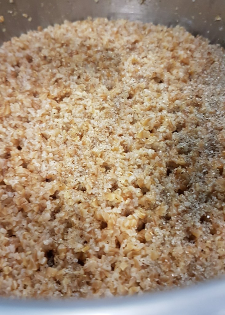 - Cuire l’épeautre : verser un volume de petit épeautre concassé dans deux volumes d’eau non salée et porter à ébullition. Maintenir la cuisson à petit feu pendant 10 minutes, jusqu’à absorbtion totale de l’eau.