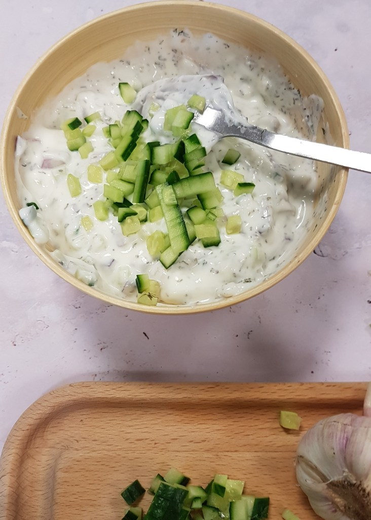 - Dans un bol, mélanger le yaourt de brebis à la grecque, l’oignon émincé, l’ail frais, le concombre et les épices pour tzatziki.